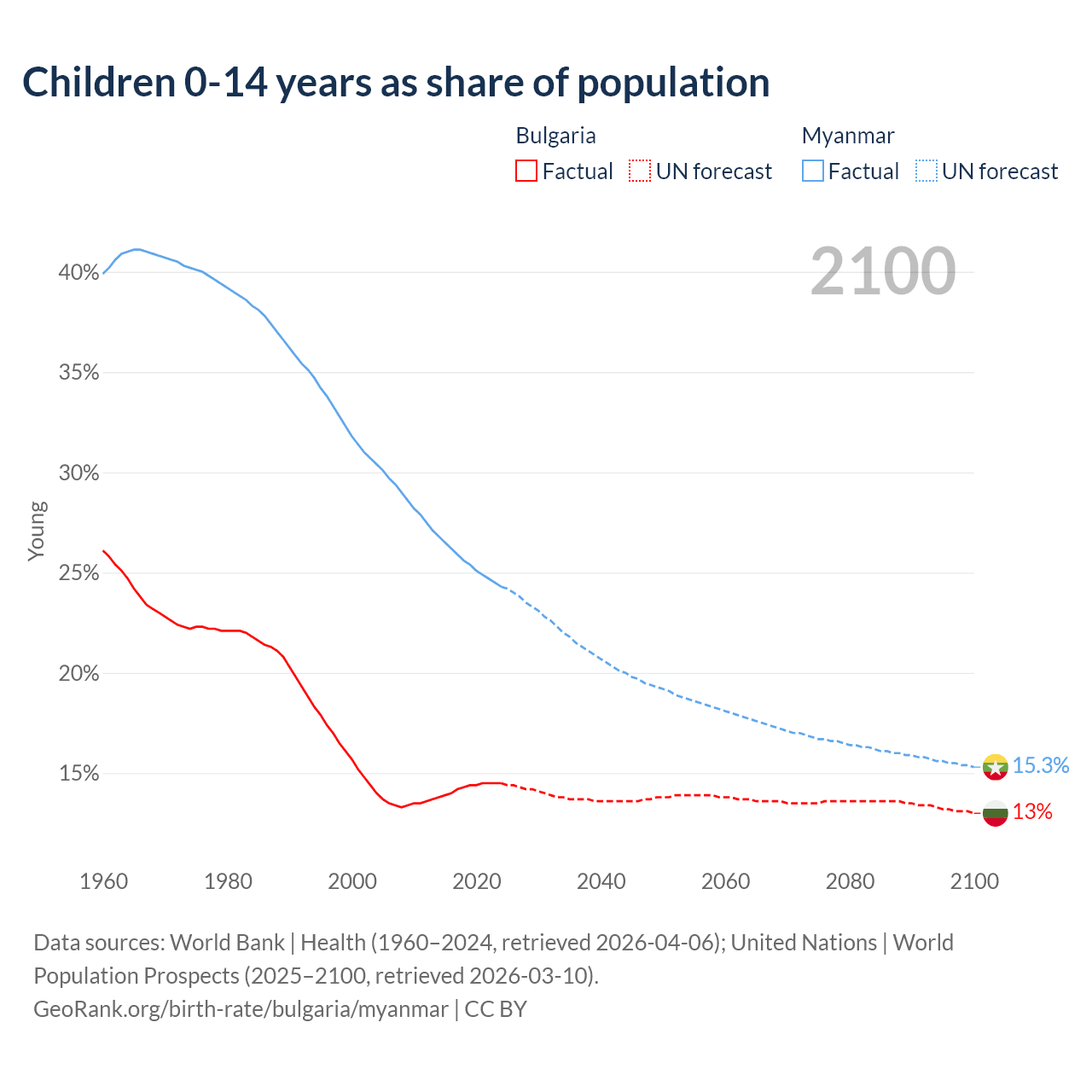 According to the latest available data on birth rates, the fertility rate in Bulgaria was 1.81 children per woman in 2023, compared to 2.12 in Myanmar in 2023. The replacement level is considered to be 2.1 children per woman.