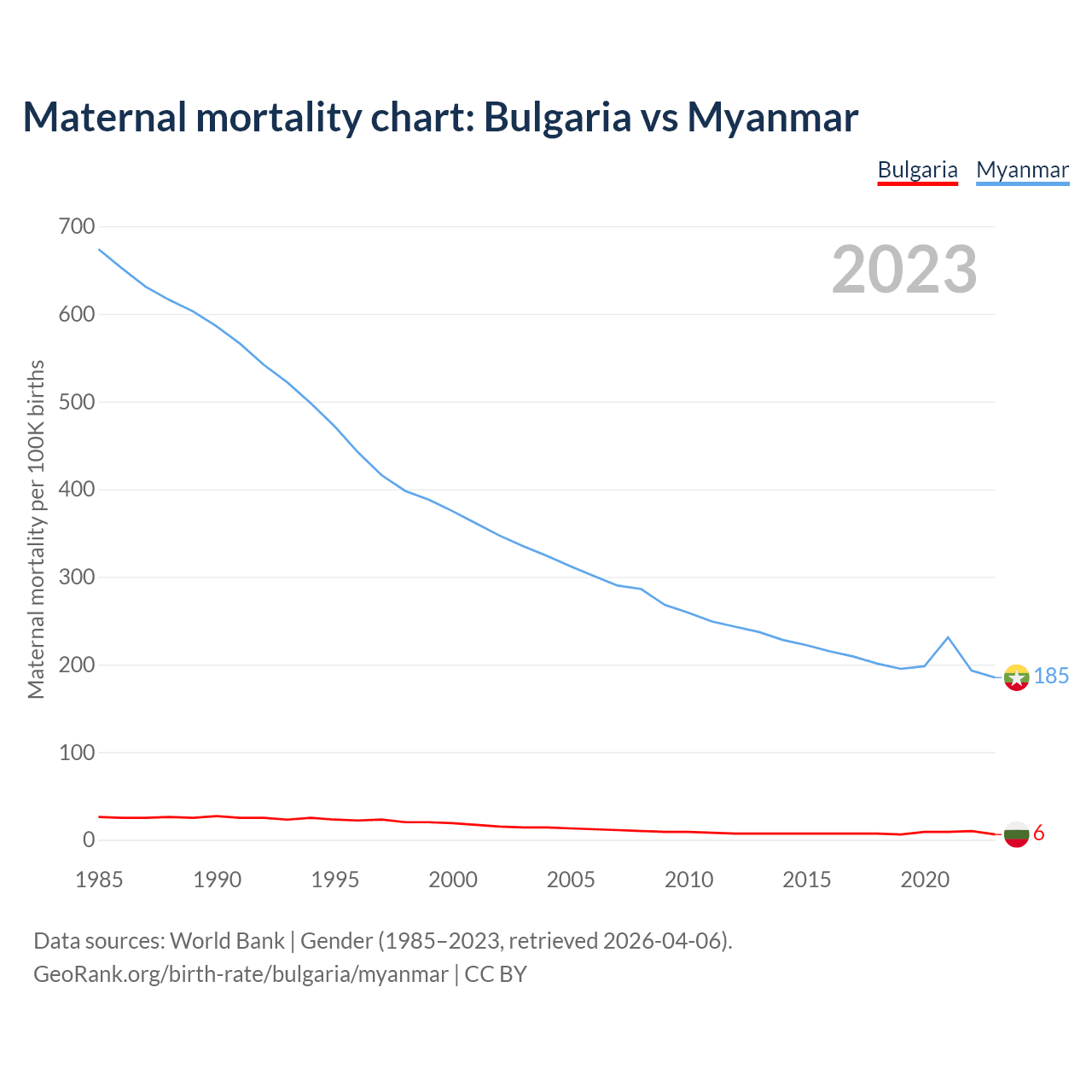 The maternal mortality rate, which is the probability of dying during childbirth or within 42 days of pregnancy termination, is 6 deaths per 100,000 live births in Bulgaria, compared to 185 deaths in Myanmar.