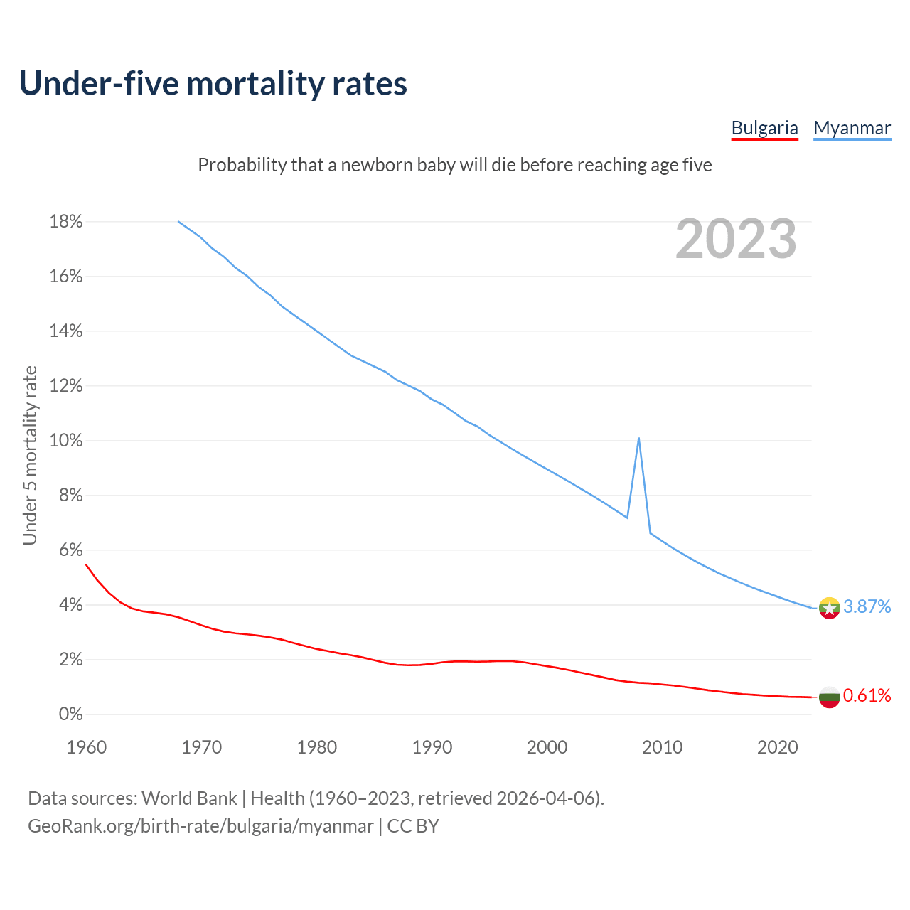 The chance that a newborn baby will die before reaching age five is 0.61% in Bulgaria and 3.87% in Myanmar. Above is a chart with historical data on under-five mortality rates.