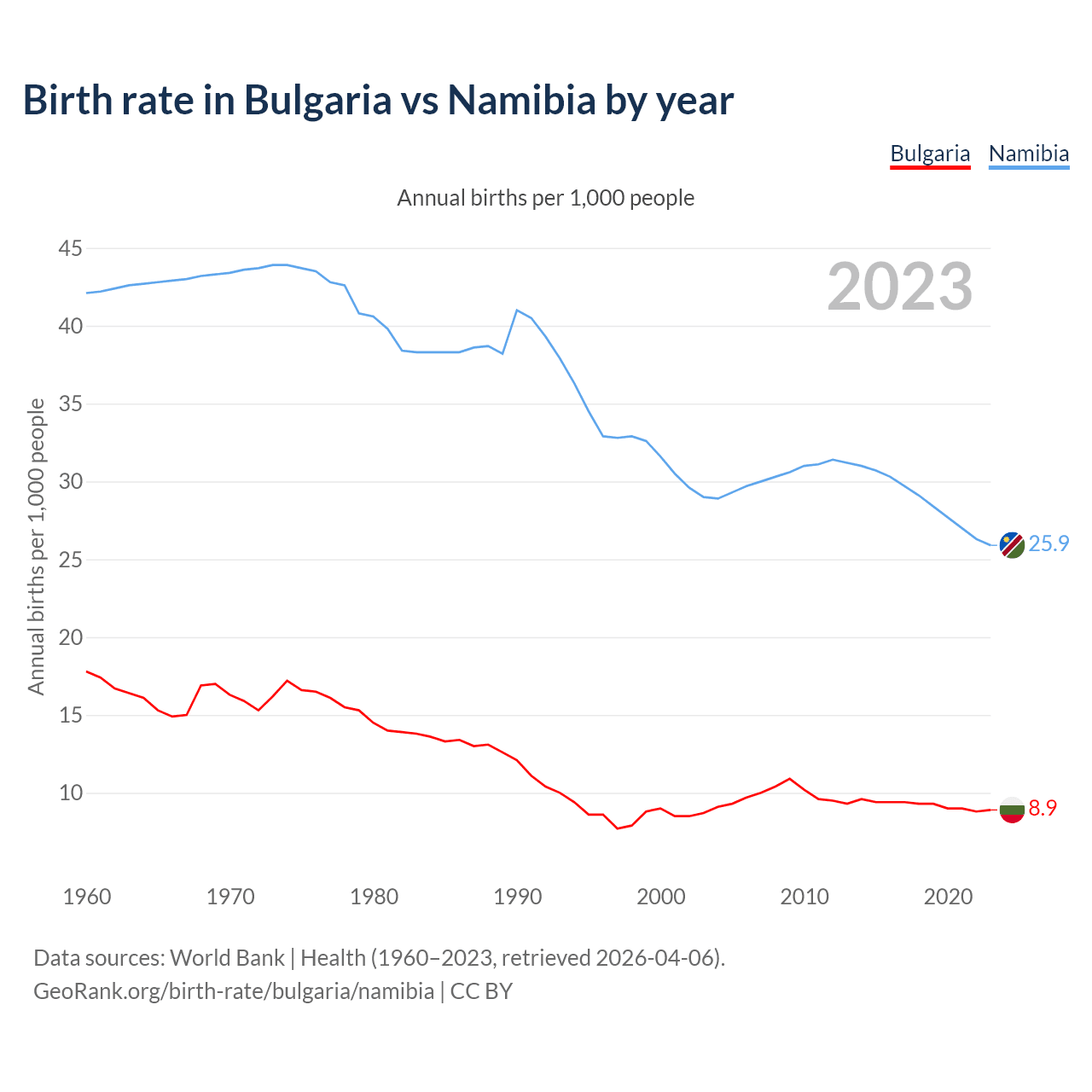 Bulgaria has an annual birth rate of 8.9 births per 1,000 people, compared to 25.9 for Namibia. The average number of children a woman is expected to have during her lifetime — the fertility rate, is 1.81 in Bulgaria and 3.21 in Namibia — 77.5% difference.