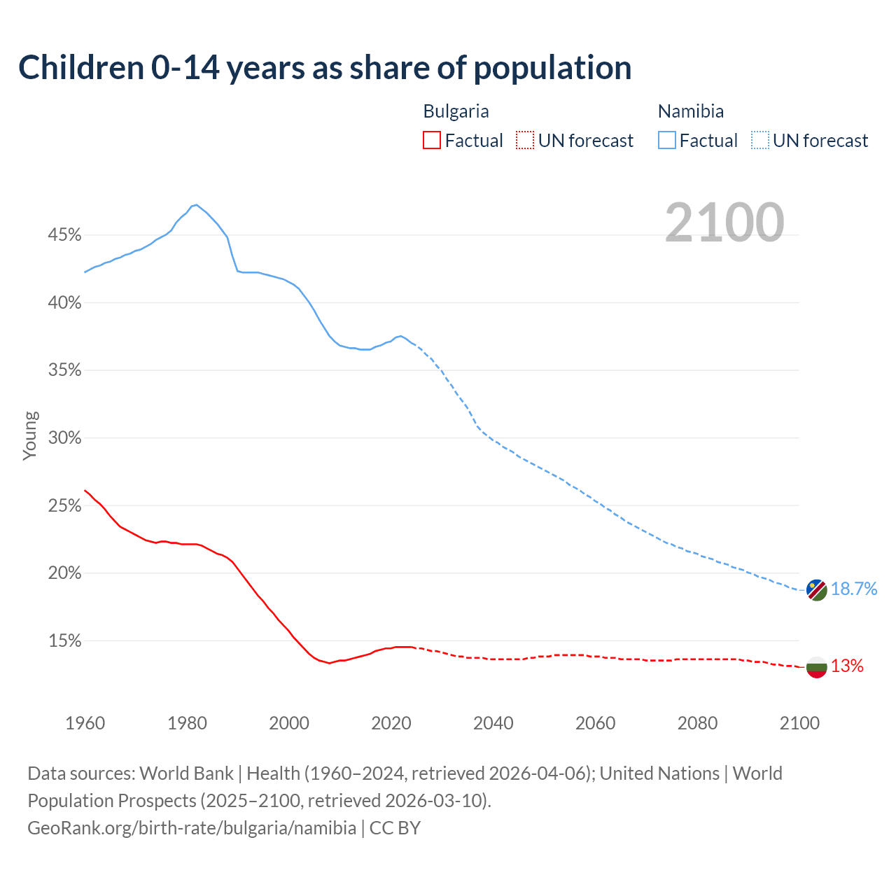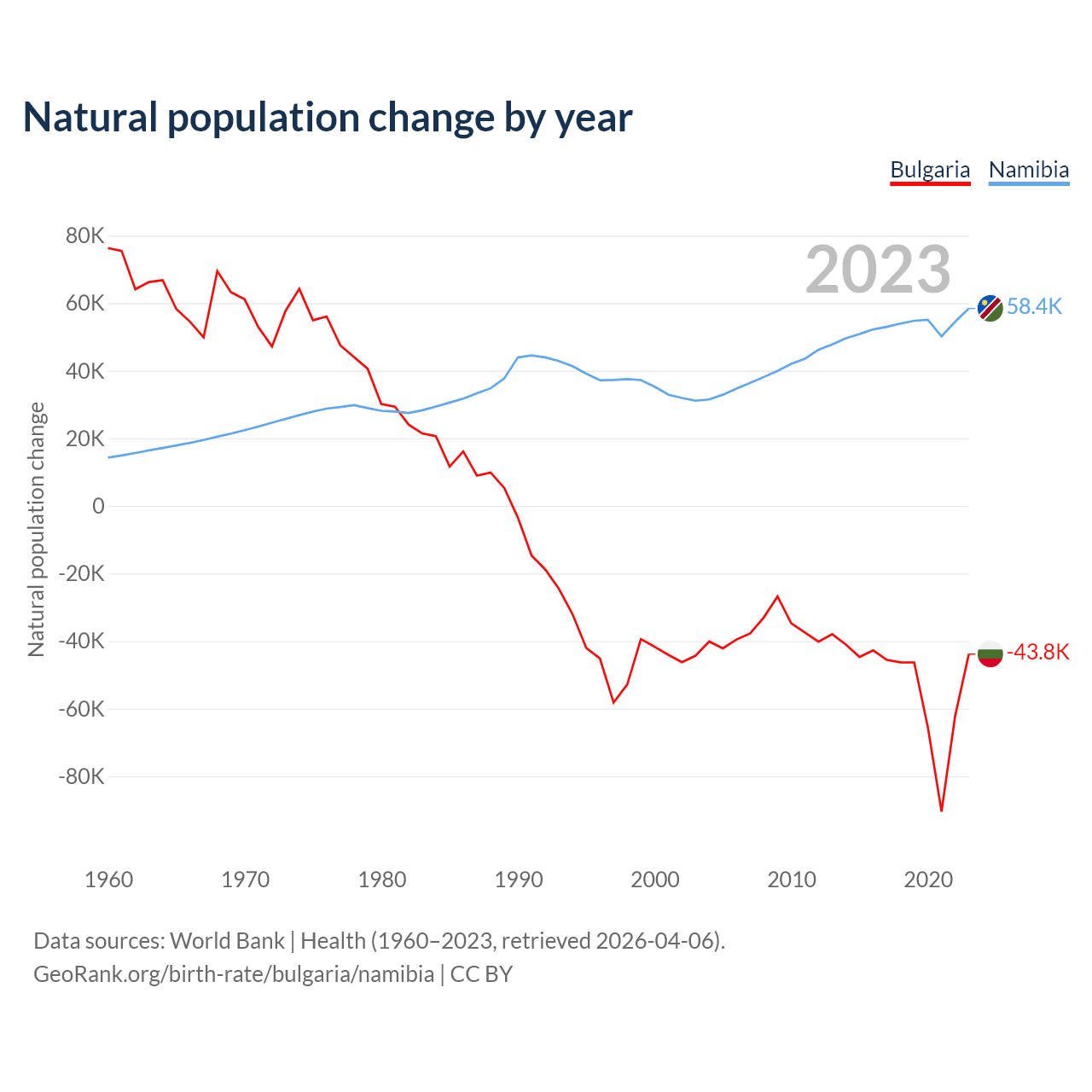 According to the latest available data on birth rates, the fertility rate in Bulgaria was 1.81 children per woman in 2023, compared to 3.21 in Namibia in 2023. The replacement level is considered to be 2.1 children per woman.