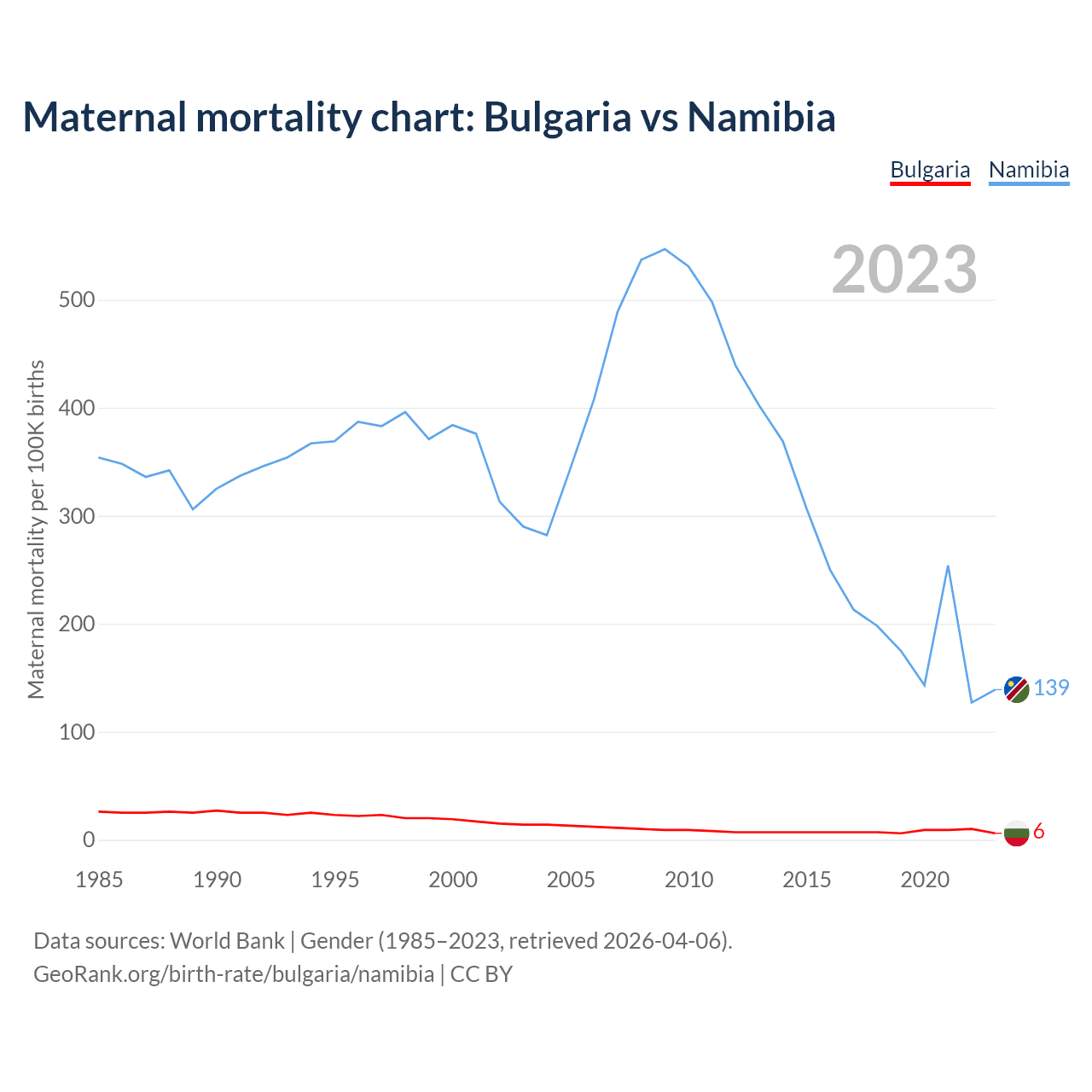 The maternal mortality rate, which is the probability of dying during childbirth or within 42 days of pregnancy termination, is 6 deaths per 100,000 live births in Bulgaria, compared to 139 deaths in Namibia.