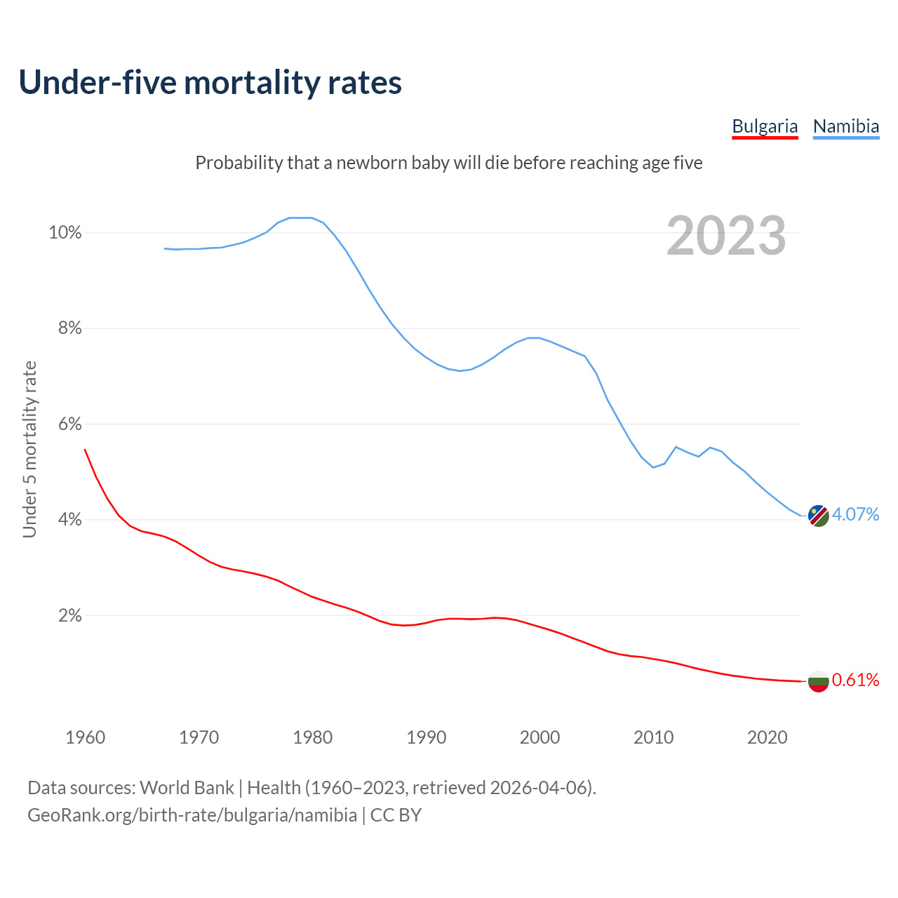 The chance that a newborn baby will die before reaching age five is 0.61% in Bulgaria and 4.07% in Namibia. Above is a chart with historical data on under-five mortality rates.