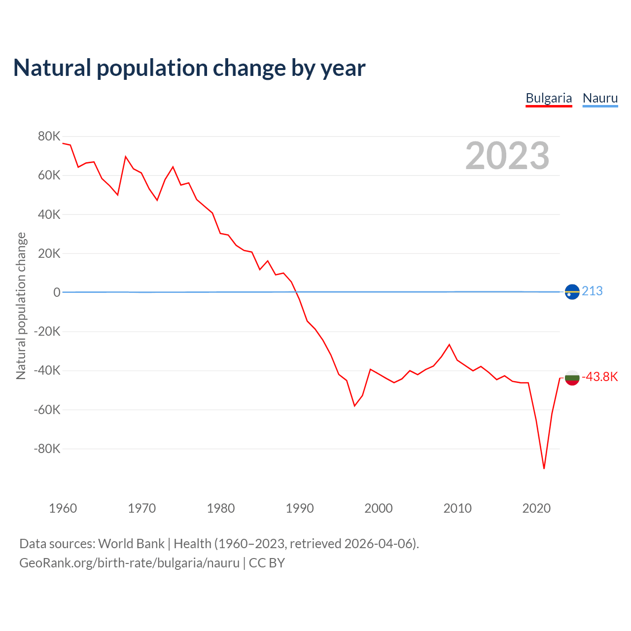 Bulgaria has an annual birth rate of 8.9 births per 1,000 people, compared to 25.5 for Nauru. The average number of children a woman is expected to have during her lifetime — the fertility rate, is 1.81 in Bulgaria and 3.33 in Nauru — 84% difference.