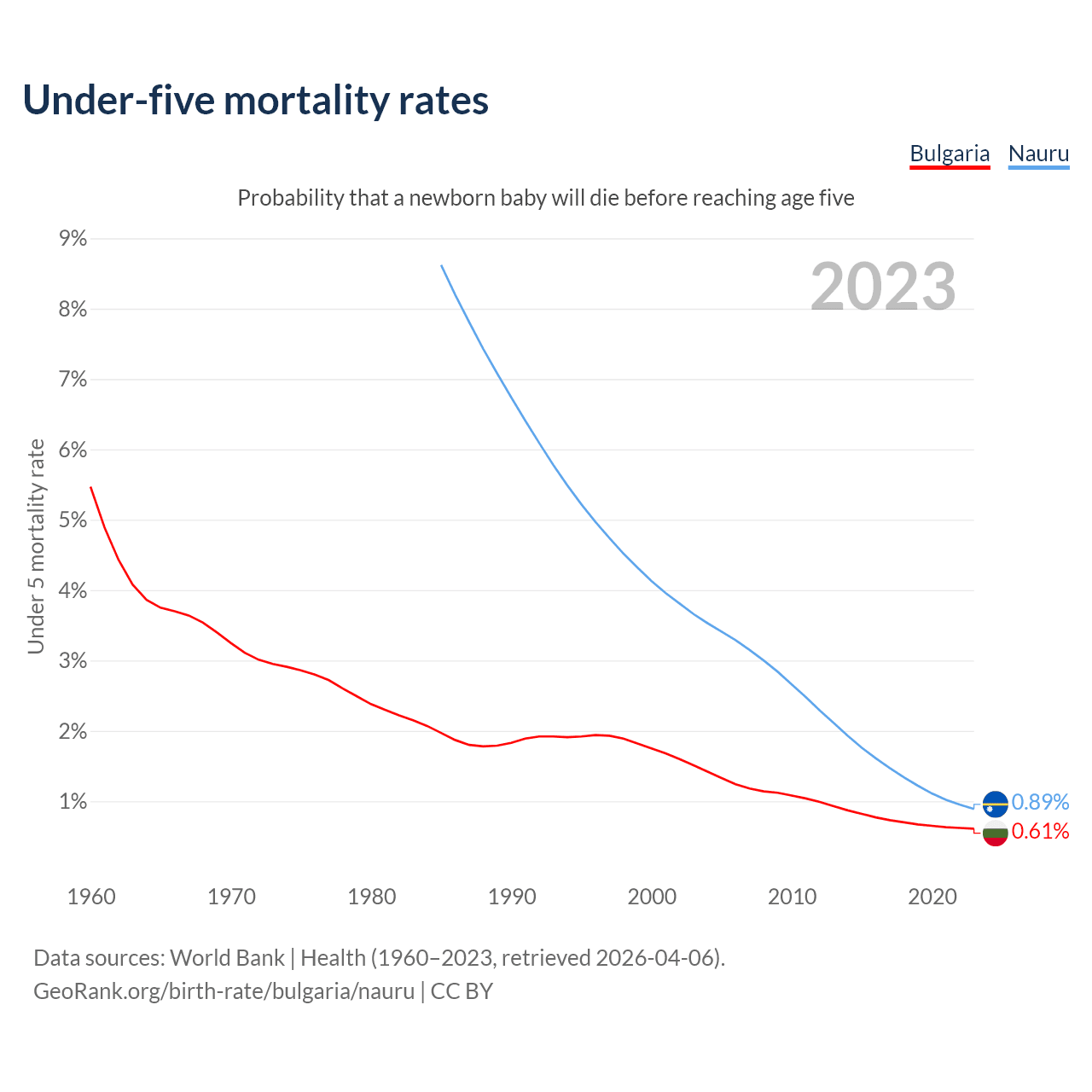 The chance that a newborn baby will die before reaching age five is 0.61% in Bulgaria and 0.89% in Nauru. Above is a chart with historical data on under-five mortality rates.