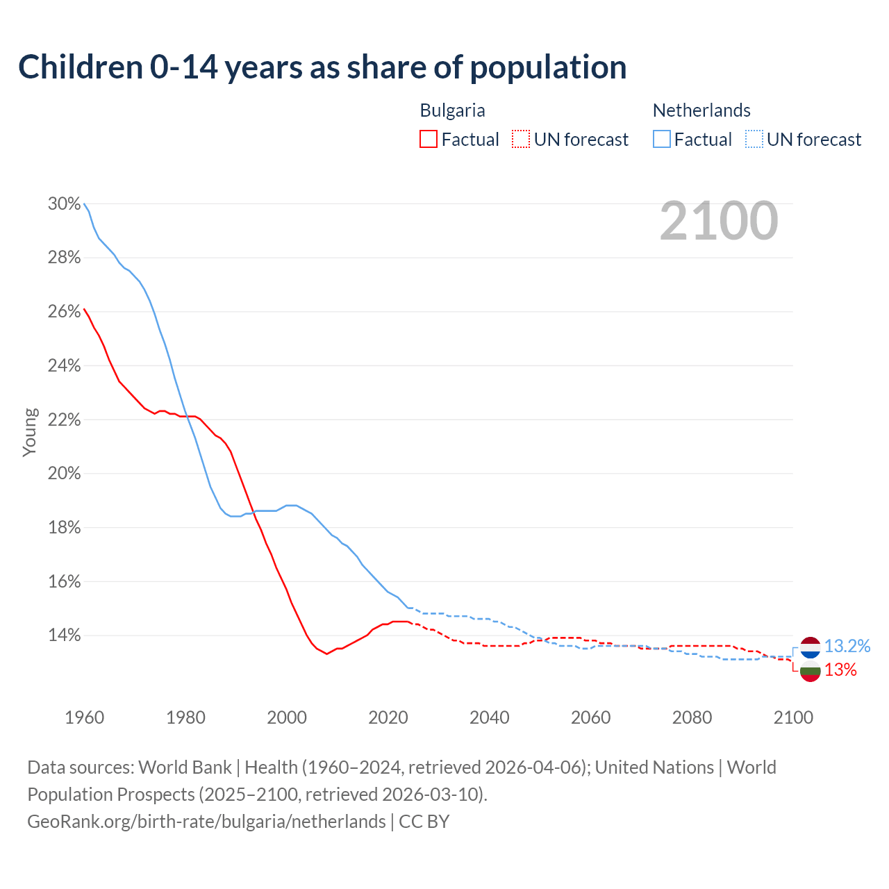 According to the latest available data on birth rates, the fertility rate in Bulgaria was 1.81 children per woman in 2023, compared to 1.43 in the Netherlands in 2023. The replacement level is considered to be 2.1 children per woman.