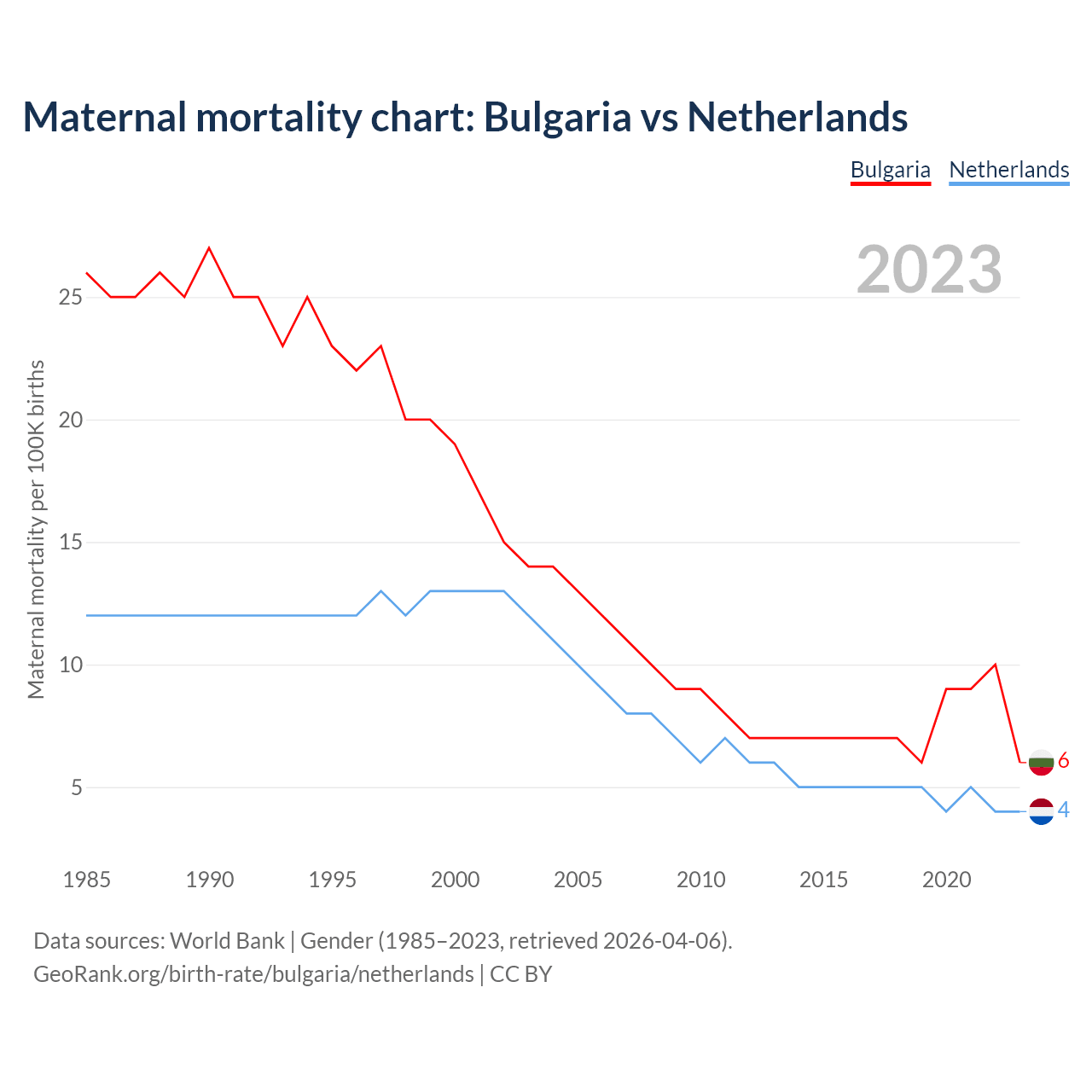 The maternal mortality rate, which is the probability of dying during childbirth or within 42 days of pregnancy termination, is 6 deaths per 100,000 live births in Bulgaria, compared to 4 deaths in the Netherlands.
