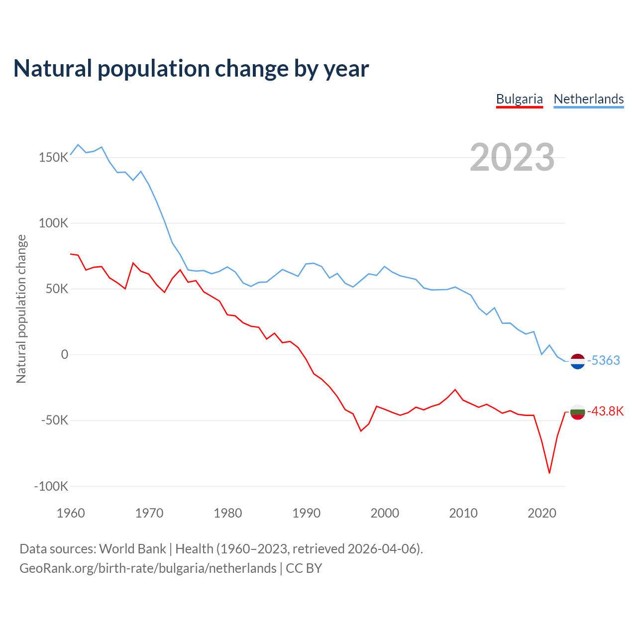 Check Bulgaria vs the Netherlands population clock for a dynamic visualization of the changing population.