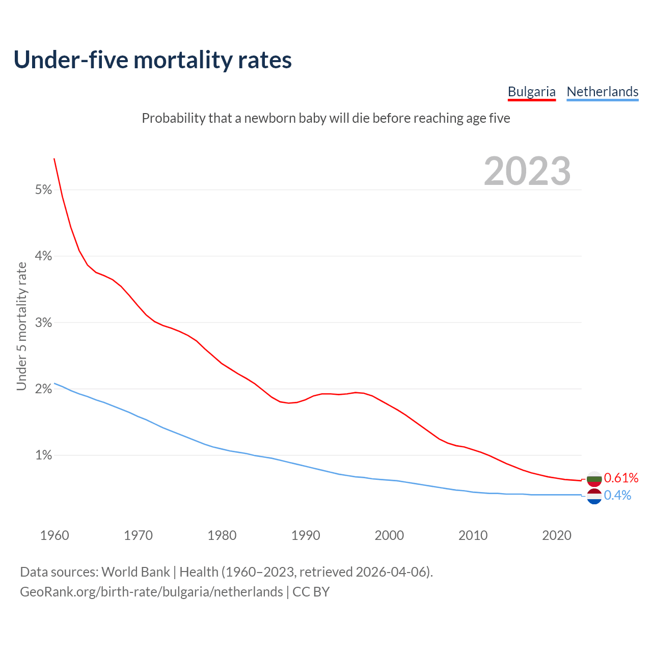 The chance that a newborn baby will die before reaching age five is 0.61% in Bulgaria and 0.4% in the Netherlands. Above is a chart with historical data on under-five mortality rates.
