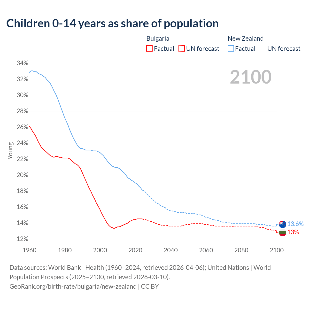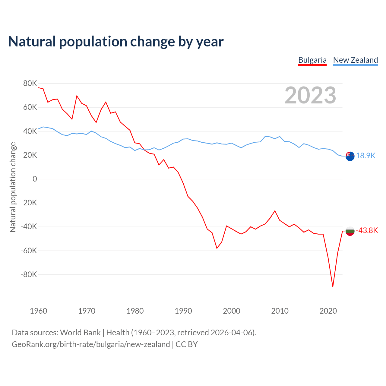 According to the latest available data on birth rates, the fertility rate in Bulgaria was 1.81 children per woman in 2023, compared to 1.56 in New Zealand in 2023. The replacement level is considered to be 2.1 children per woman.