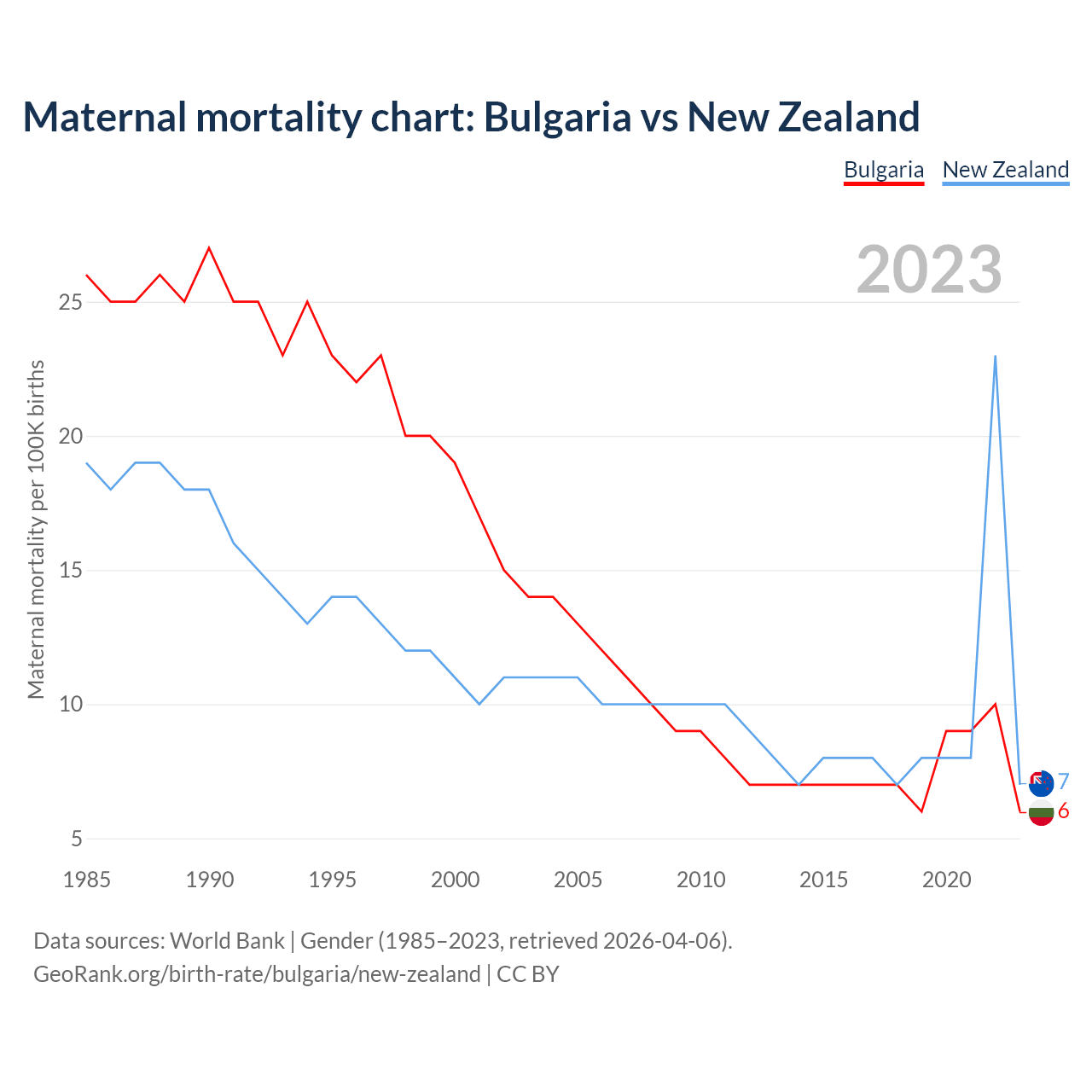 The maternal mortality rate, which is the probability of dying during childbirth or within 42 days of pregnancy termination, is 6 deaths per 100,000 live births in Bulgaria, compared to 7 deaths in New Zealand.
