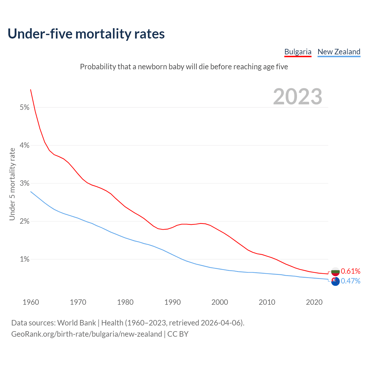 The chance that a newborn baby will die before reaching age five is 0.61% in Bulgaria and 0.47% in New Zealand. Above is a chart with historical data on under-five mortality rates.