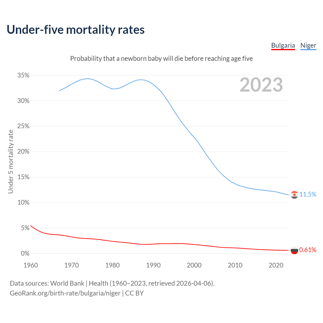 The chance that a newborn baby will die before reaching age five is 0.61% in Bulgaria and 11.5% in Niger. Above is a chart with historical data on under-five mortality rates.