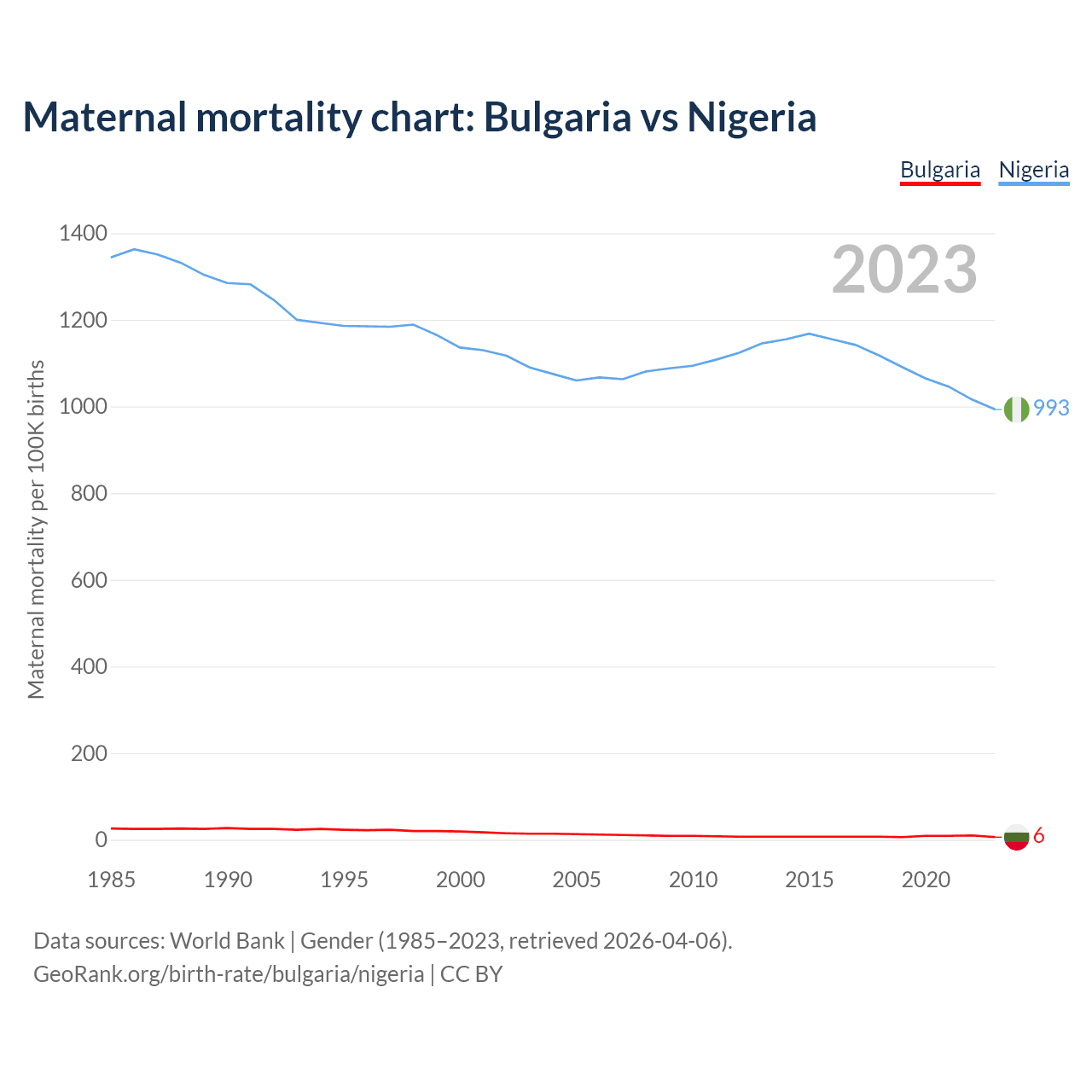 The maternal mortality rate, which is the probability of dying during childbirth or within 42 days of pregnancy termination, is 6 deaths per 100,000 live births in Bulgaria, compared to 993 deaths in Nigeria.