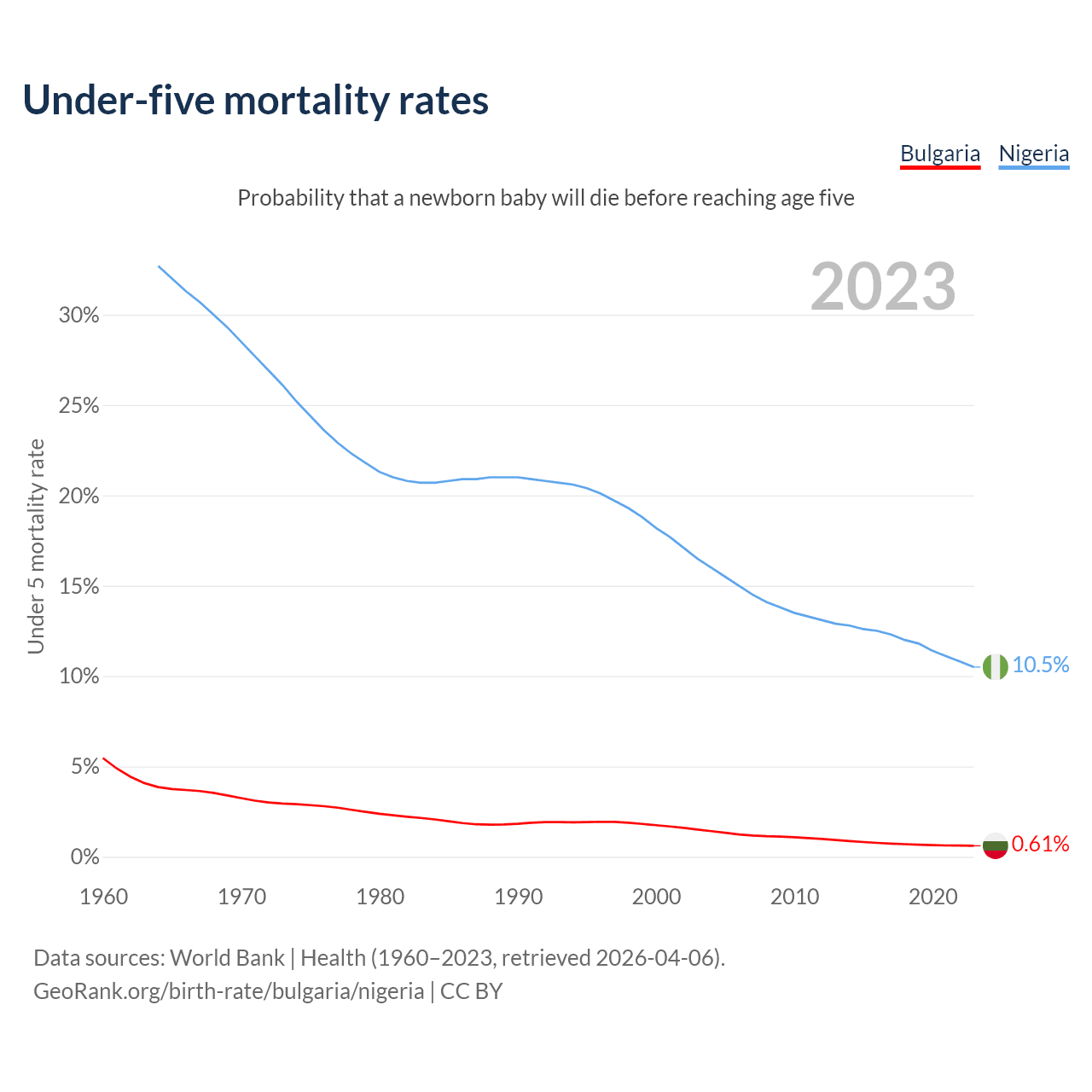 The chance that a newborn baby will die before reaching age five is 0.61% in Bulgaria and 10.5% in Nigeria. Above is a chart with historical data on under-five mortality rates.