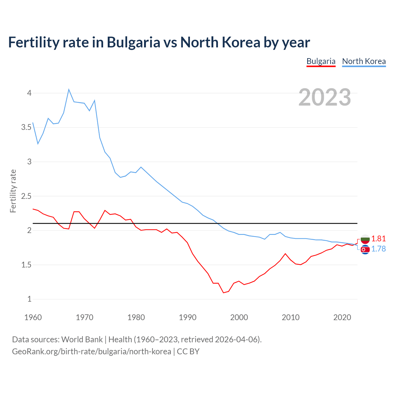 1960 vs 2023, the fertility rate has decreased by 21.6% in Bulgaria and by 50.1% in North Korea — in 1960, it was 2.31 and 3.57, respectively.