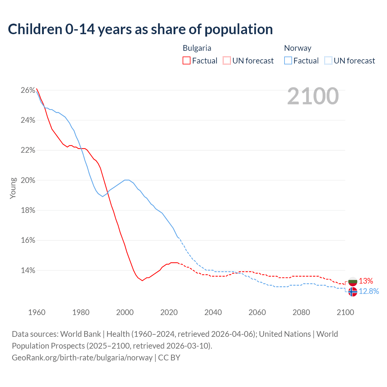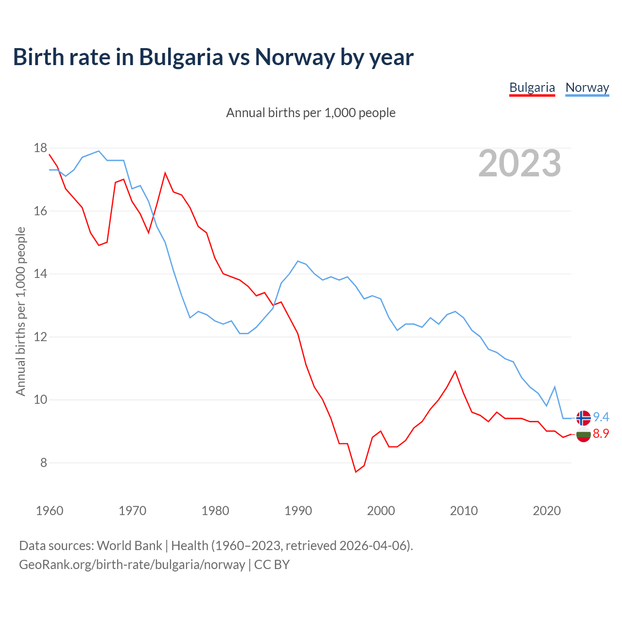 According to the latest available data on birth rates, the fertility rate in Bulgaria was 1.81 children per woman in 2023, compared to 1.4 in Norway in 2023. The replacement level is considered to be 2.1 children per woman.