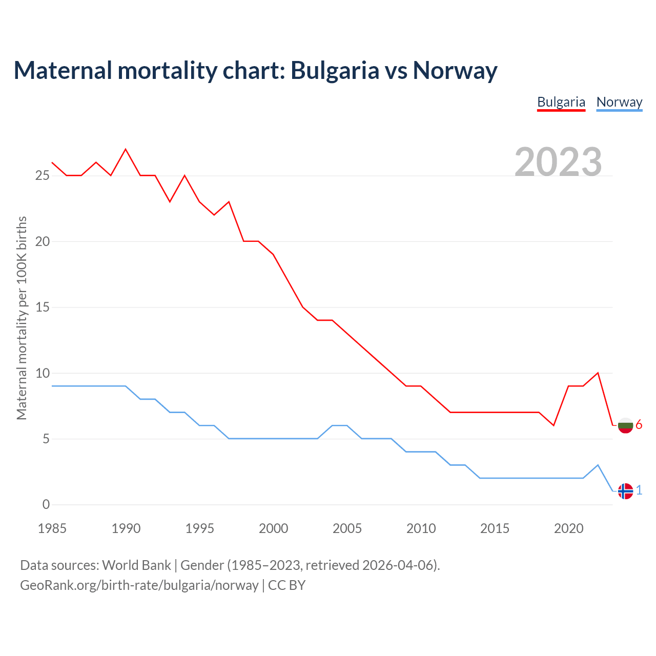 The maternal mortality rate, which is the probability of dying during childbirth or within 42 days of pregnancy termination, is 6 deaths per 100,000 live births in Bulgaria, compared to 1 deaths in Norway.
