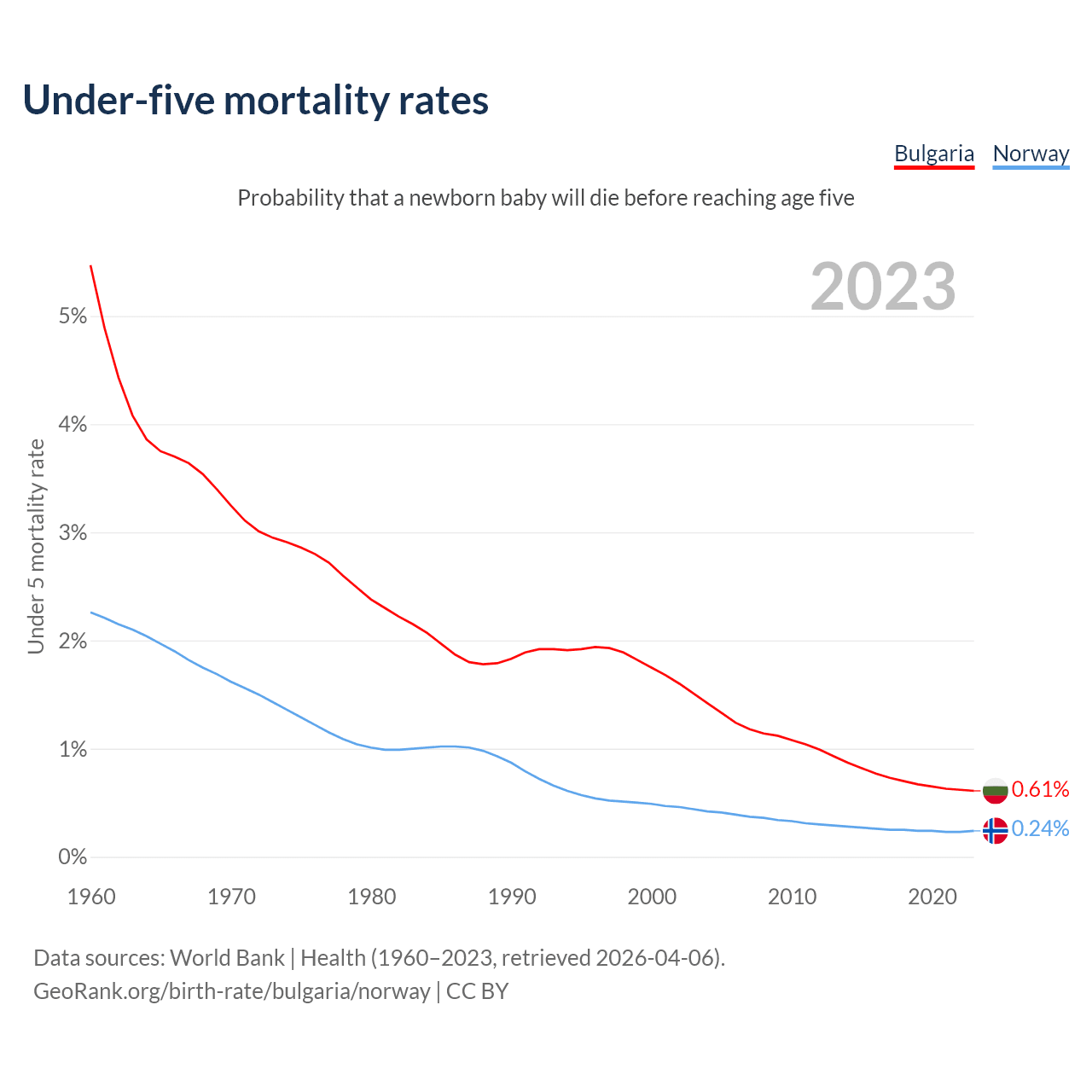 The chance that a newborn baby will die before reaching age five is 0.61% in Bulgaria and 0.24% in Norway. Above is a chart with historical data on under-five mortality rates.