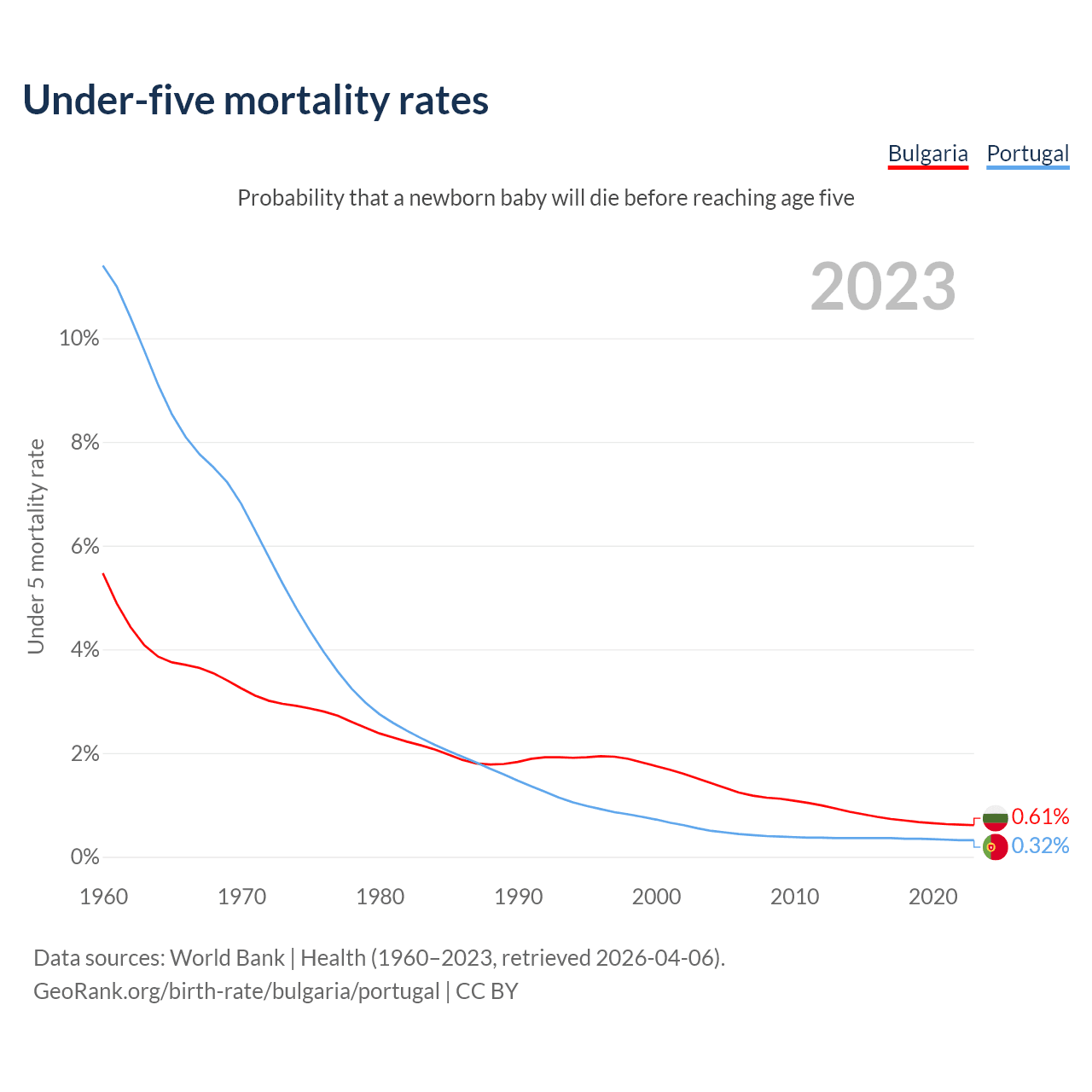 The chance that a newborn baby will die before reaching age five is 0.61% in Bulgaria and 0.32% in Portugal. Above is a chart with historical data on under-five mortality rates.