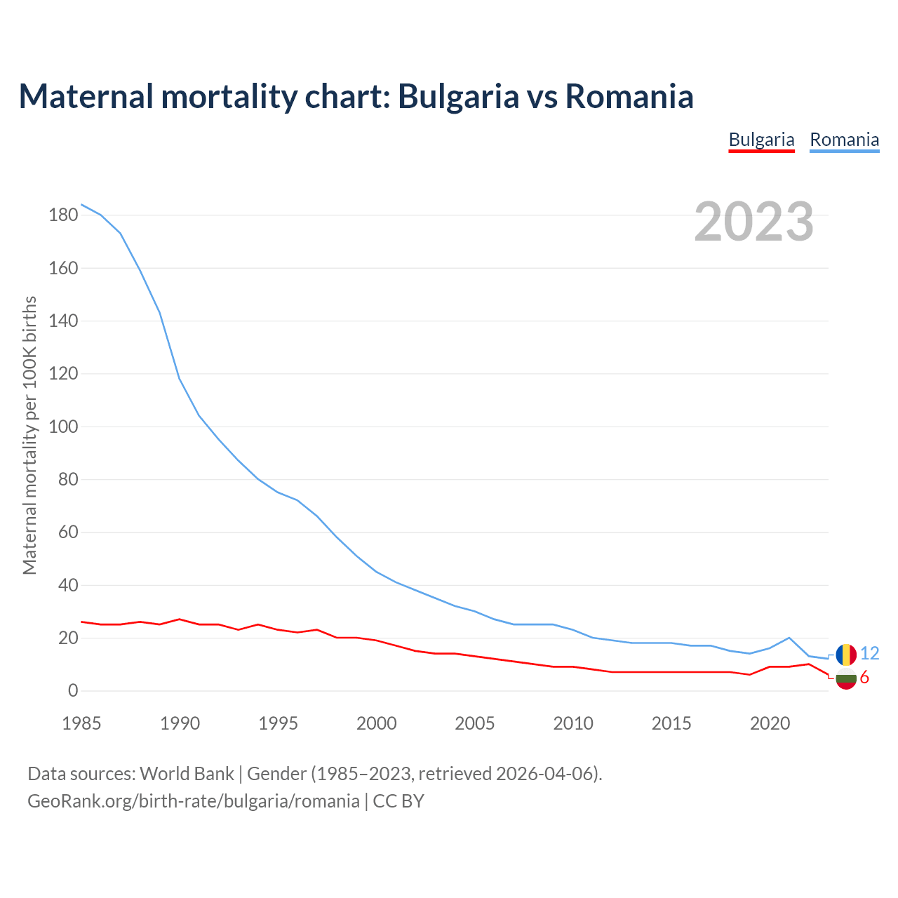 The maternal mortality rate, which is the probability of dying during childbirth or within 42 days of pregnancy termination, is 6 deaths per 100,000 live births in Bulgaria, compared to 12 deaths in Romania.