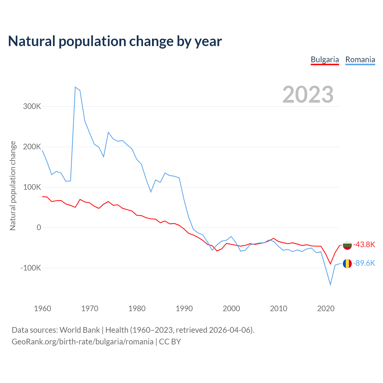 According to the latest available data on birth rates, the fertility rate in Bulgaria was 1.81 children per woman in 2023, compared to 1.71 in Romania in 2023. The replacement level is considered to be 2.1 children per woman.