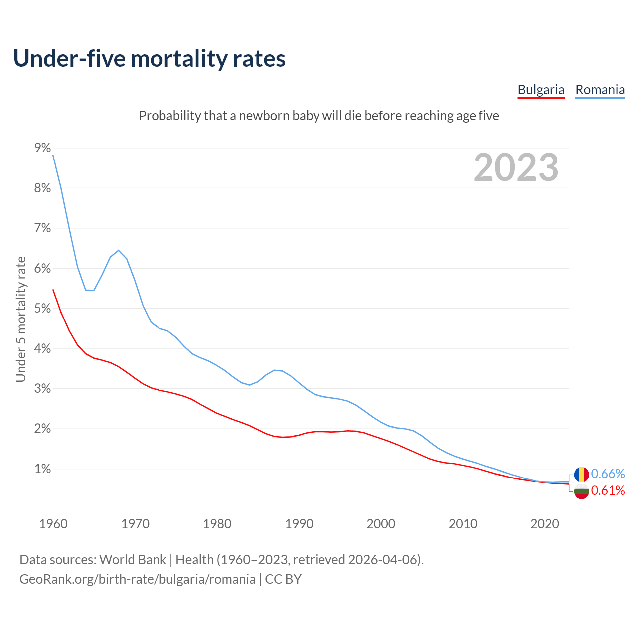 The chance that a newborn baby will die before reaching age five is 0.61% in Bulgaria and 0.66% in Romania. Above is a chart with historical data on under-five mortality rates.