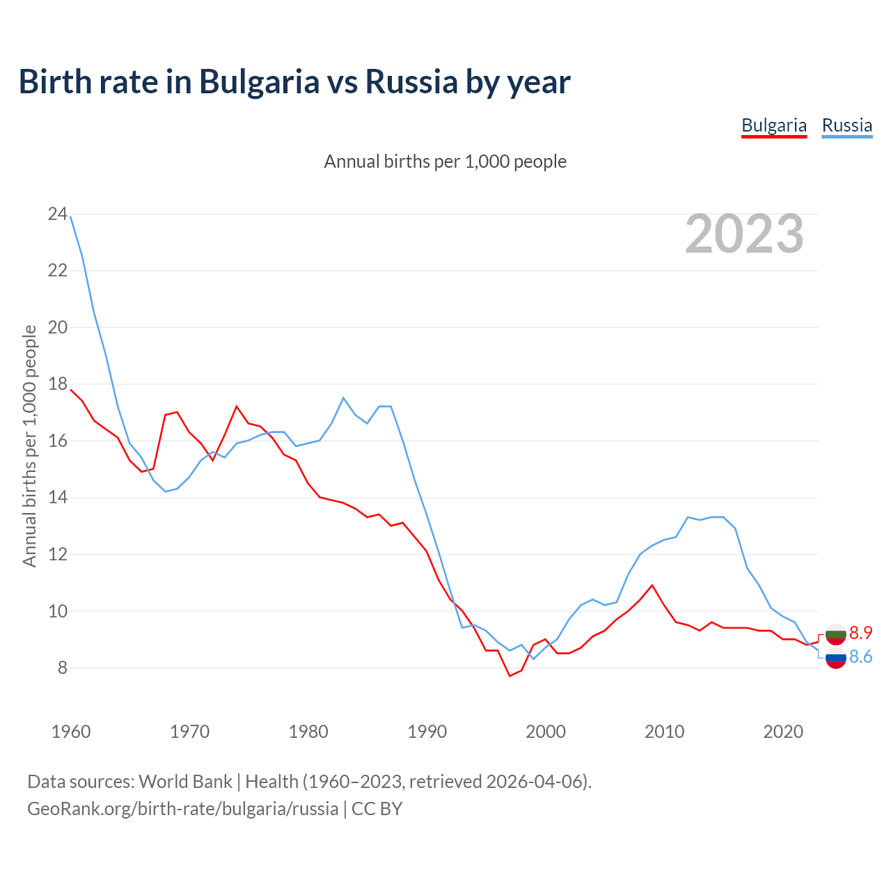 Bulgaria has an annual birth rate of 8.9 births per 1,000 people, compared to 8.6 for Russia. The average number of children a woman is expected to have during her lifetime — the fertility rate, is 1.81 in Bulgaria and 1.41 in Russia — 22.1% difference.