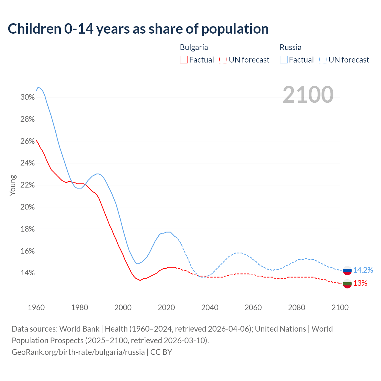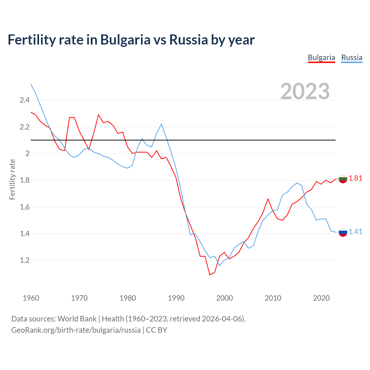 According to the latest available data on birth rates, the fertility rate in Bulgaria was 1.81 children per woman in 2023, compared to 1.41 in Russia in 2023. The replacement level is considered to be 2.1 children per woman.