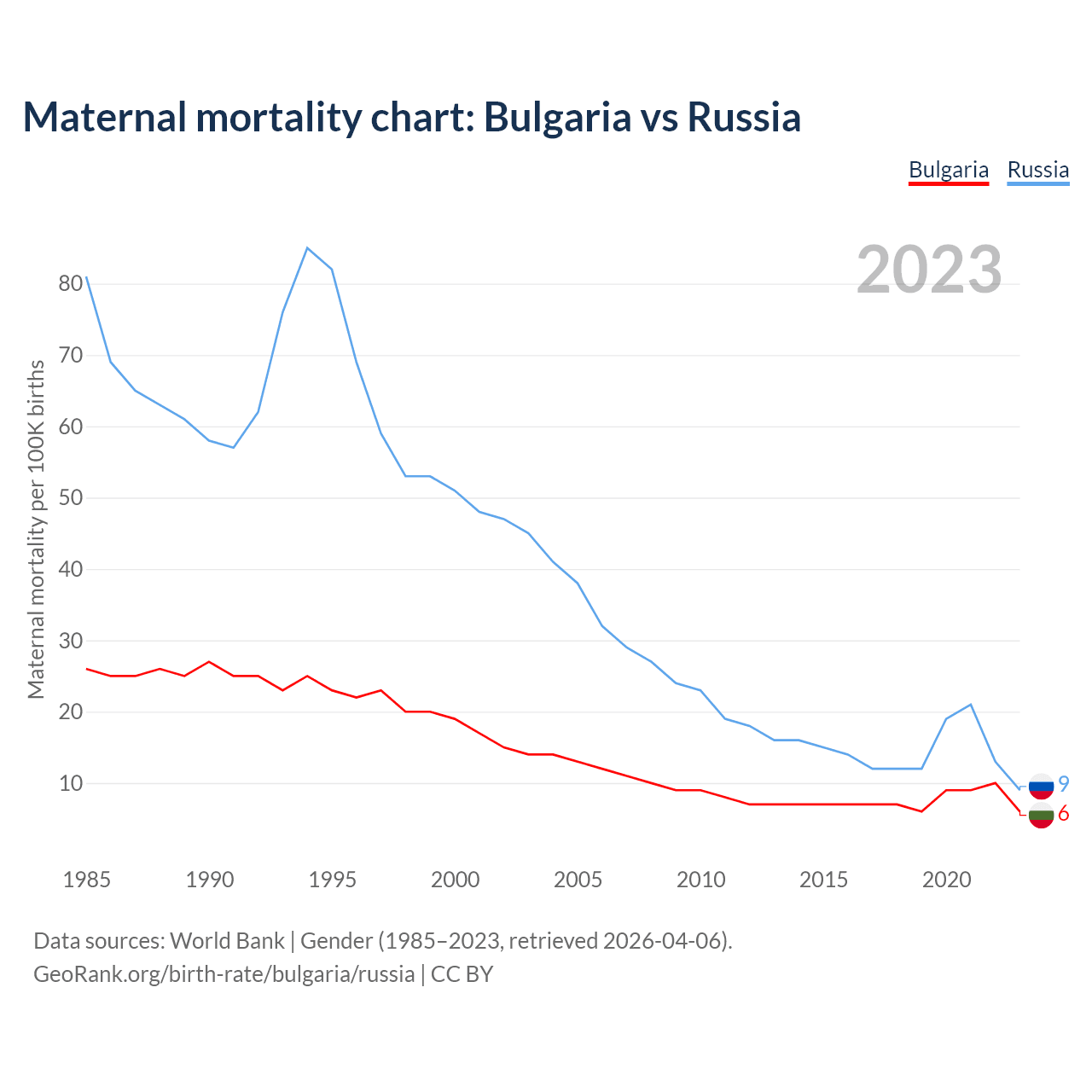 The maternal mortality rate, which is the probability of dying during childbirth or within 42 days of pregnancy termination, is 6 deaths per 100,000 live births in Bulgaria, compared to 9 deaths in Russia.