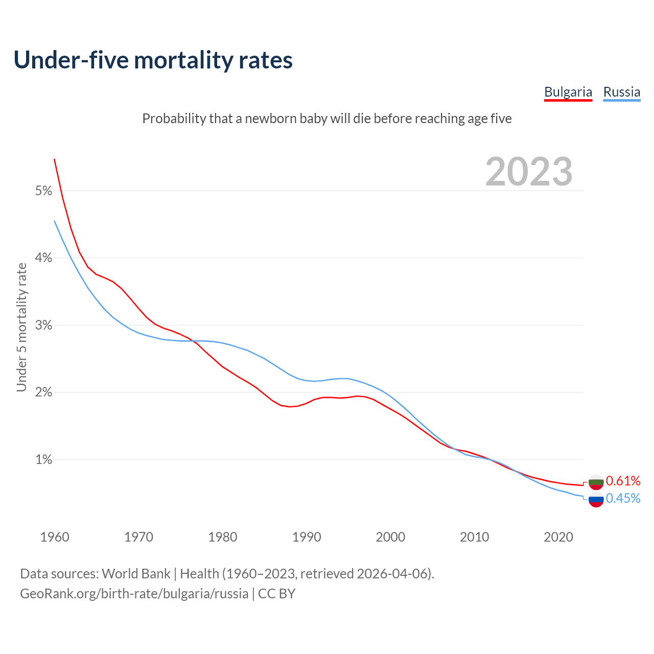 The chance that a newborn baby will die before reaching age five is 0.61% in Bulgaria and 0.45% in Russia. Above is a chart with historical data on under-five mortality rates.