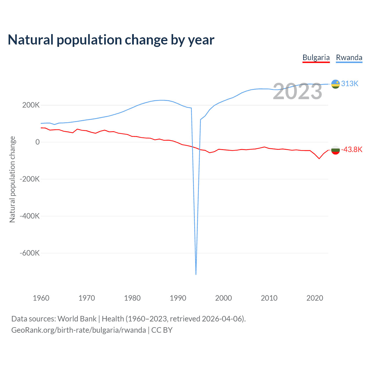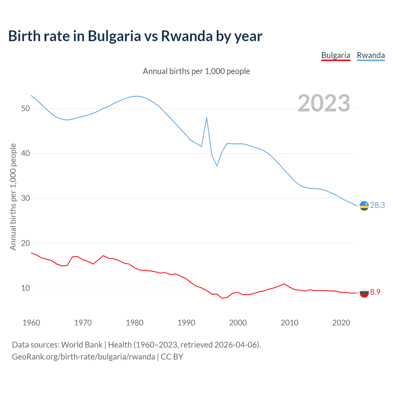 Bulgaria has an annual birth rate of 8.9 births per 1,000 people, compared to 28.3 for Rwanda. The average number of children a woman is expected to have during her lifetime — the fertility rate, is 1.81 in Bulgaria and 3.7 in Rwanda — 104.3% difference.