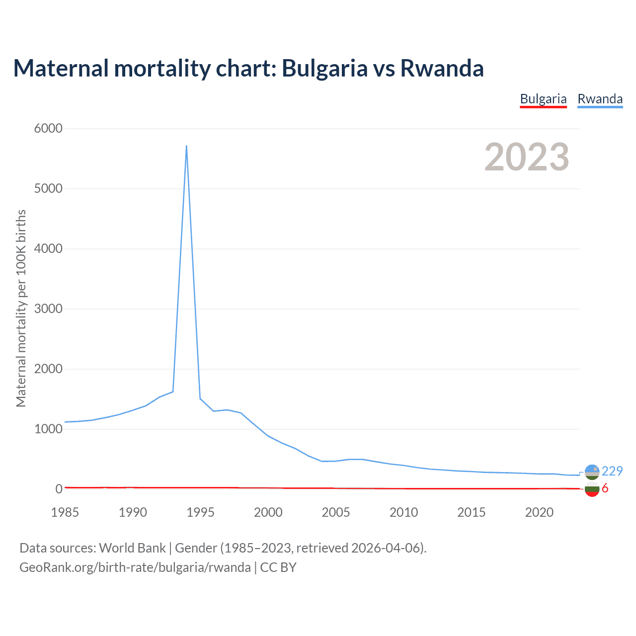 The maternal mortality rate, which is the probability of dying during childbirth or within 42 days of pregnancy termination, is 6 deaths per 100,000 live births in Bulgaria, compared to 229 deaths in Rwanda.