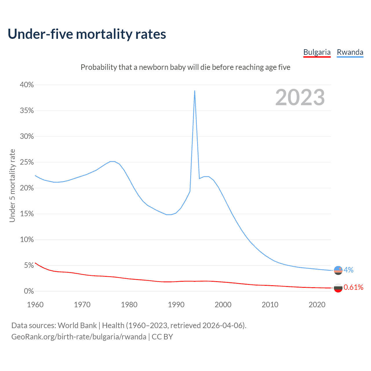The chance that a newborn baby will die before reaching age five is 0.61% in Bulgaria and 4% in Rwanda. Above is a chart with historical data on under-five mortality rates.