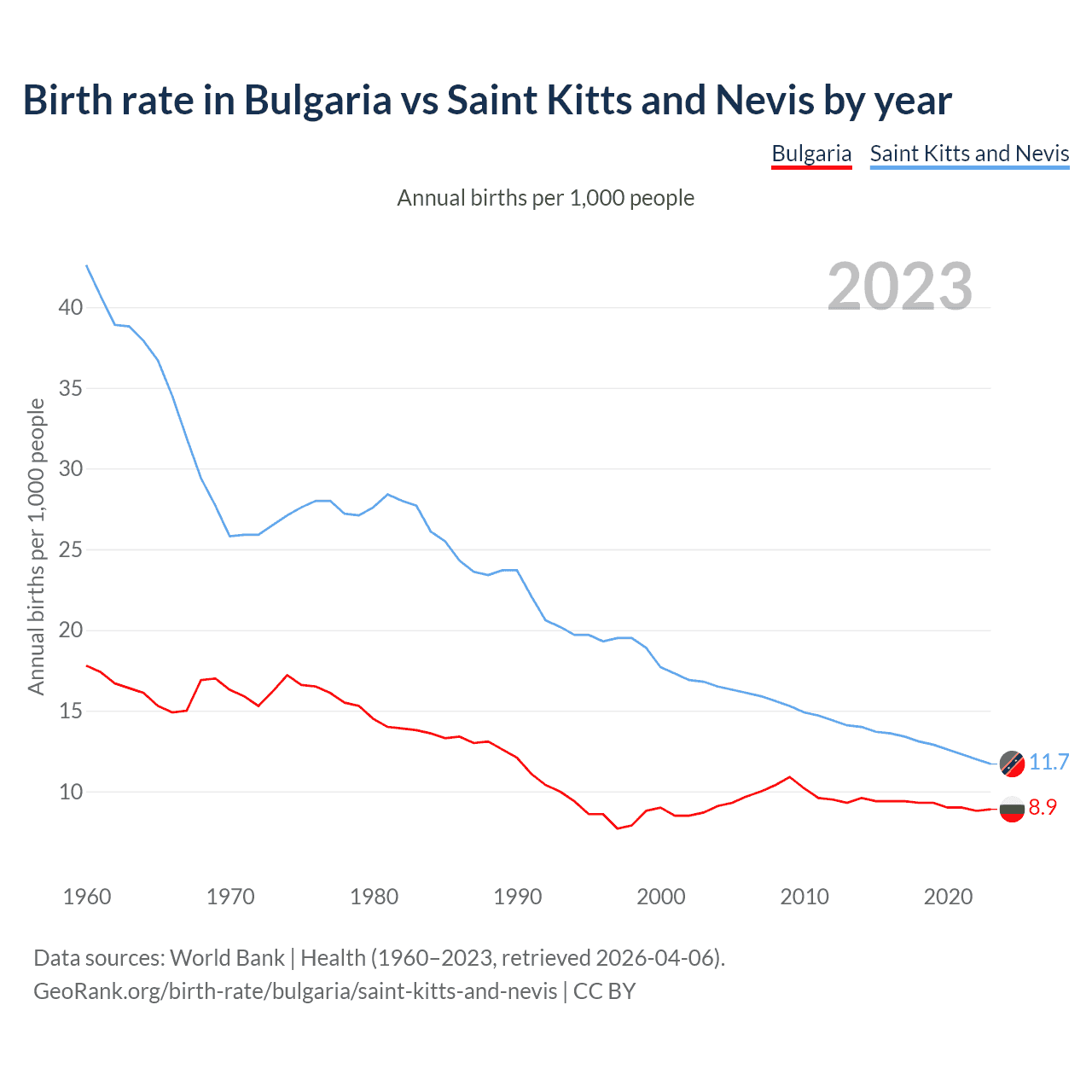 Bulgaria has an annual birth rate of 8.9 births per 1,000 people, compared to 11.7 for Saint Kitts and Nevis. The average number of children a woman is expected to have during her lifetime — the fertility rate, is 1.81 in Bulgaria and 1.51 in Saint Kitts and Nevis — 16.9% difference.