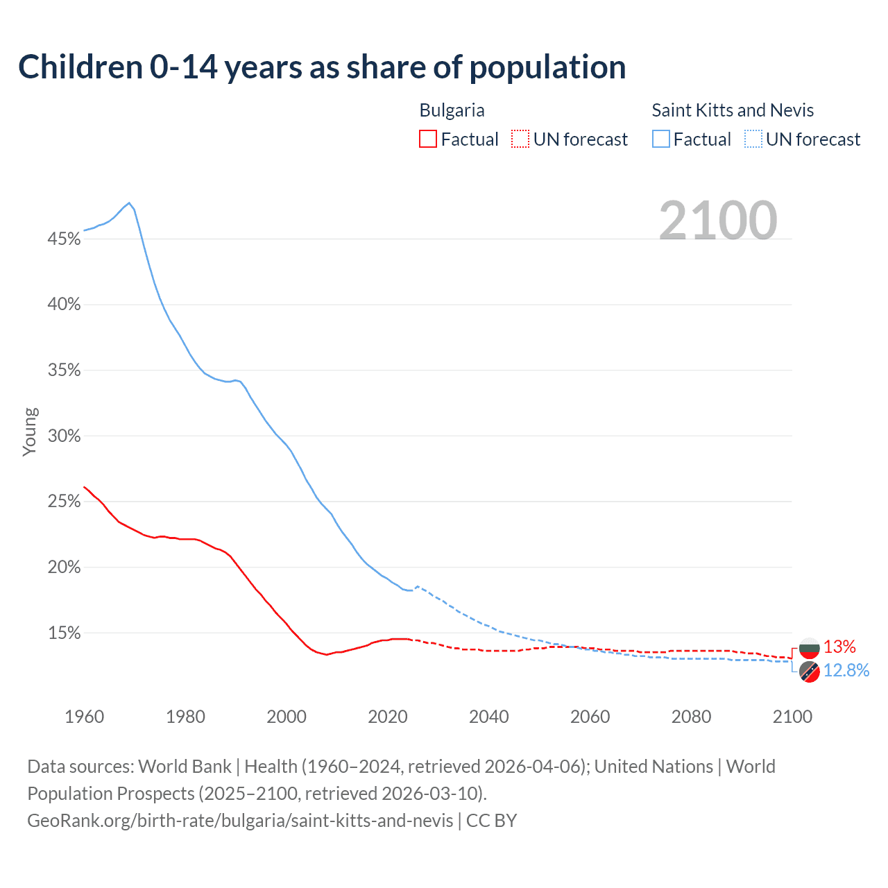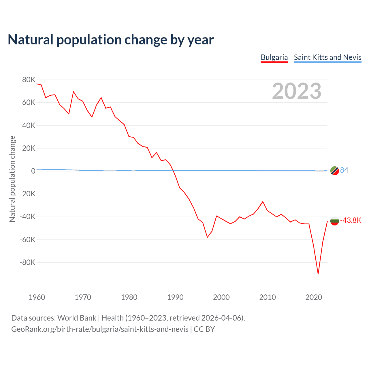 According to the latest available data on birth rates, the fertility rate in Bulgaria was 1.81 children per woman in 2023, compared to 1.51 in Saint Kitts and Nevis in 2023. The replacement level is considered to be 2.1 children per woman.
