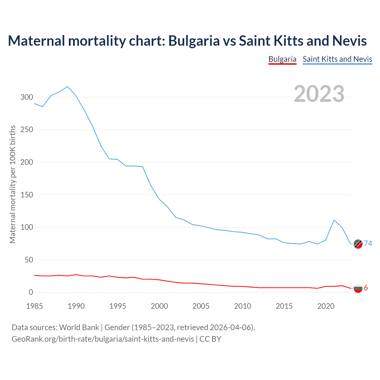 The maternal mortality rate, which is the probability of dying during childbirth or within 42 days of pregnancy termination, is 6 deaths per 100,000 live births in Bulgaria, compared to 74 deaths in Saint Kitts and Nevis.