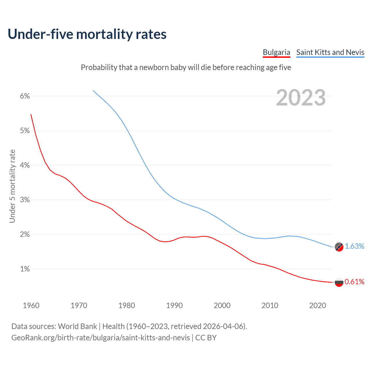 The chance that a newborn baby will die before reaching age five is 0.61% in Bulgaria and 1.63% in Saint Kitts and Nevis. Above is a chart with historical data on under-five mortality rates.