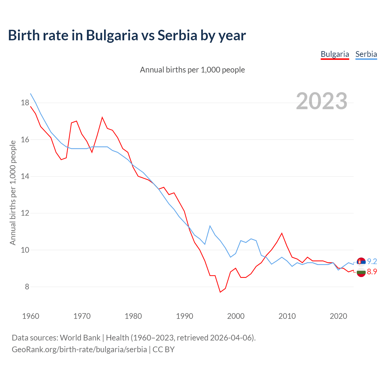 Bulgaria has an annual birth rate of 8.9 births per 1,000 people, compared to 9.2 for Serbia. The average number of children a woman is expected to have during her lifetime — the fertility rate, is 1.81 in Bulgaria and 1.61 in Serbia — 11% difference.