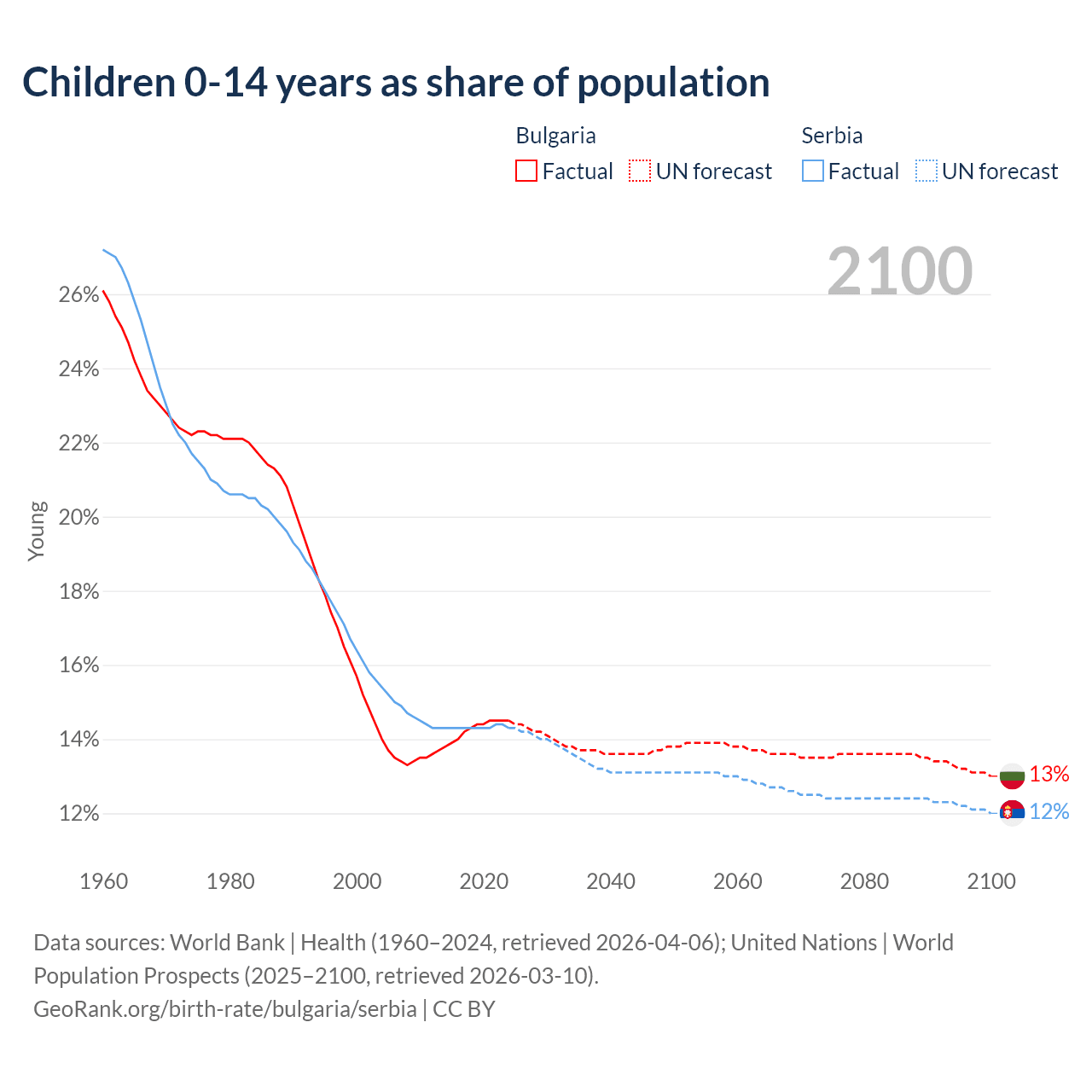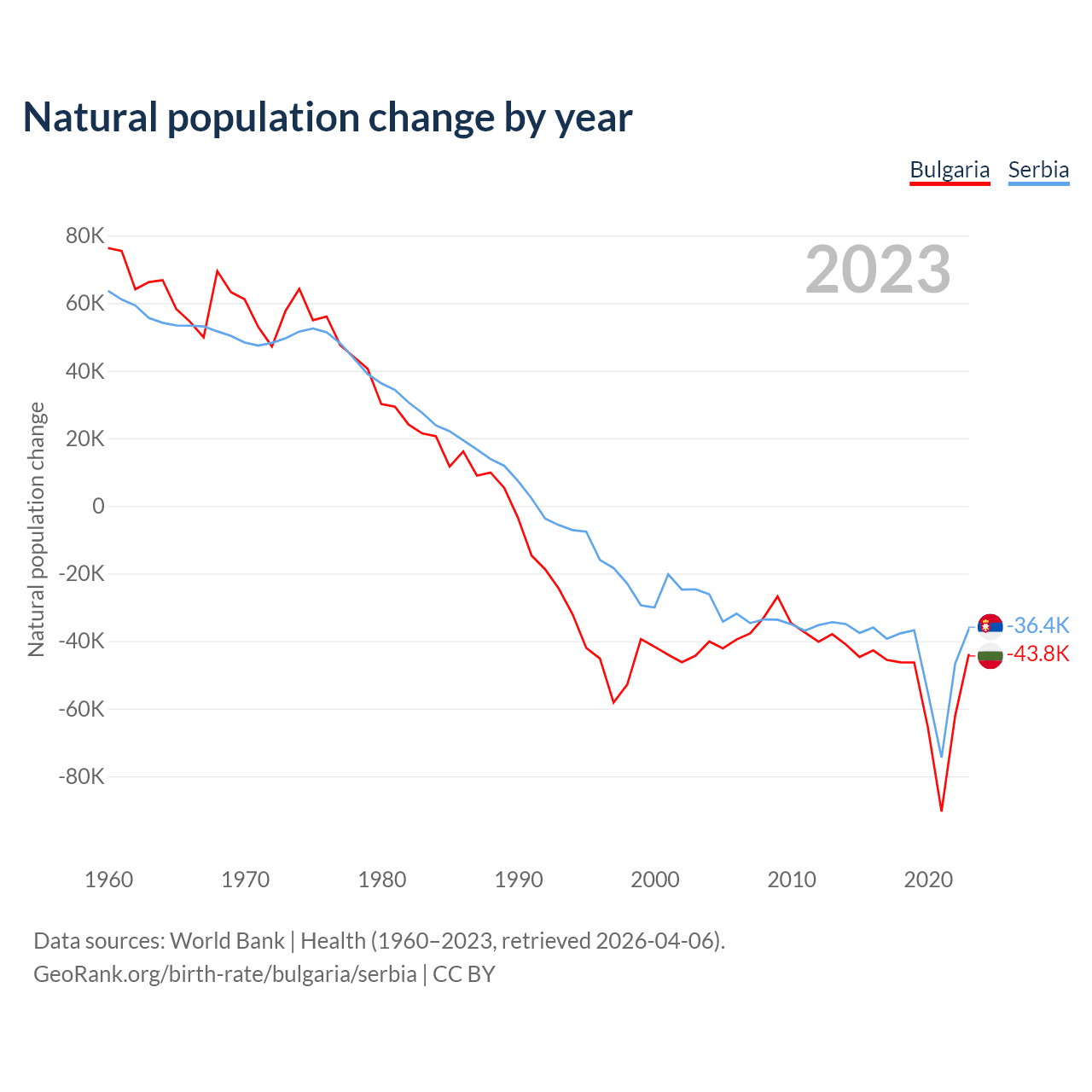 According to the latest available data on birth rates, the fertility rate in Bulgaria was 1.81 children per woman in 2023, compared to 1.61 in Serbia in 2023. The replacement level is considered to be 2.1 children per woman.
