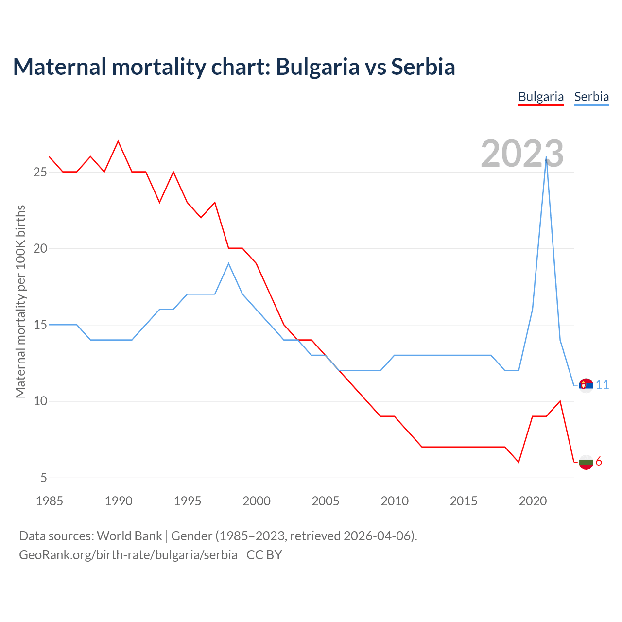 The maternal mortality rate, which is the probability of dying during childbirth or within 42 days of pregnancy termination, is 6 deaths per 100,000 live births in Bulgaria, compared to 11 deaths in Serbia.