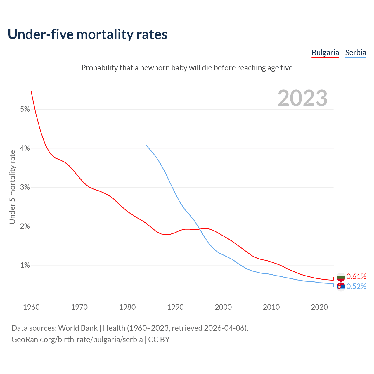 The chance that a newborn baby will die before reaching age five is 0.61% in Bulgaria and 0.52% in Serbia. Above is a chart with historical data on under-five mortality rates.