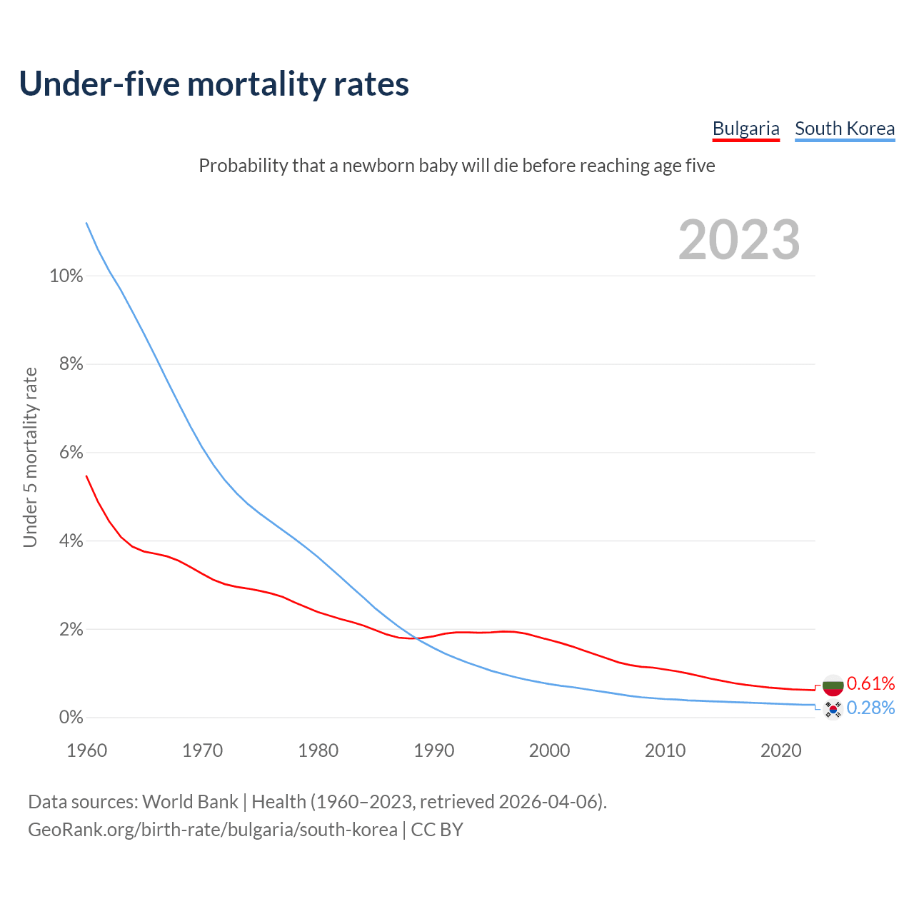 The chance that a newborn baby will die before reaching age five is 0.61% in Bulgaria and 0.28% in South Korea. Above is a chart with historical data on under-five mortality rates.
