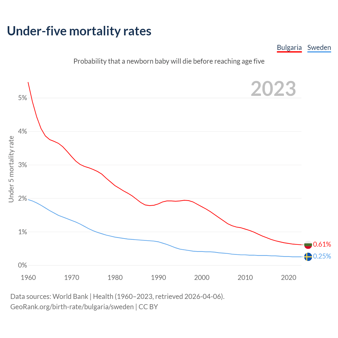 The chance that a newborn baby will die before reaching age five is 0.61% in Bulgaria and 0.25% in Sweden. Above is a chart with historical data on under-five mortality rates.