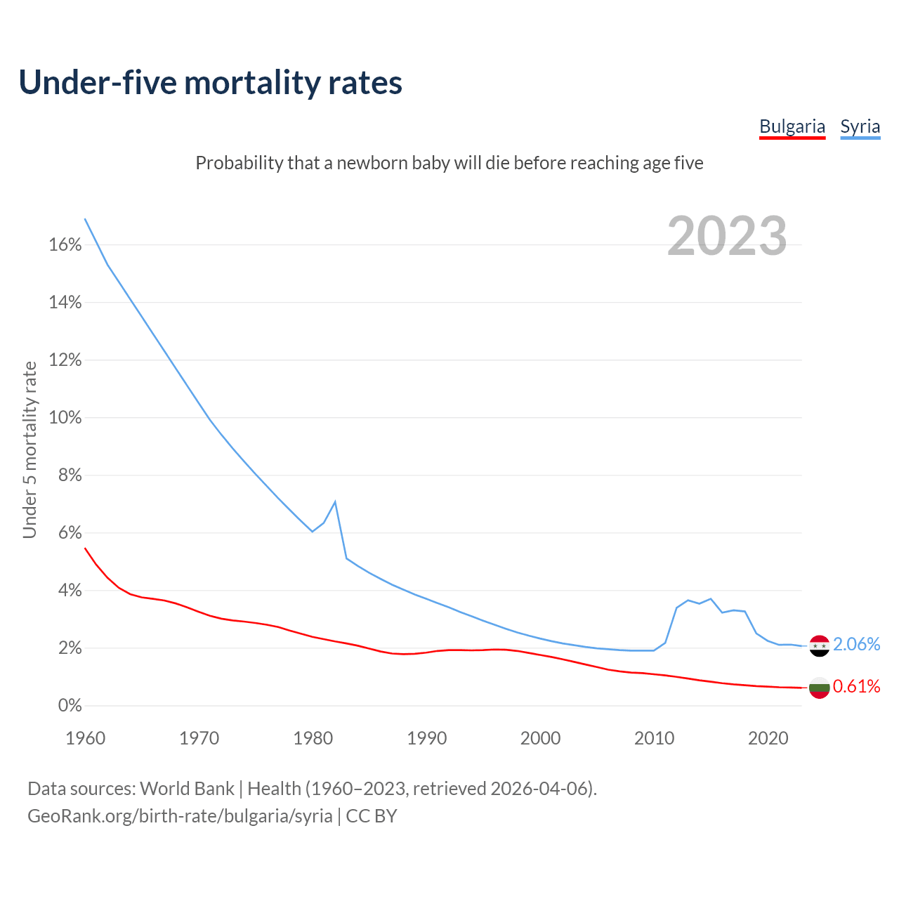 The chance that a newborn baby will die before reaching age five is 0.61% in Bulgaria and 2.06% in Syria. Above is a chart with historical data on under-five mortality rates.