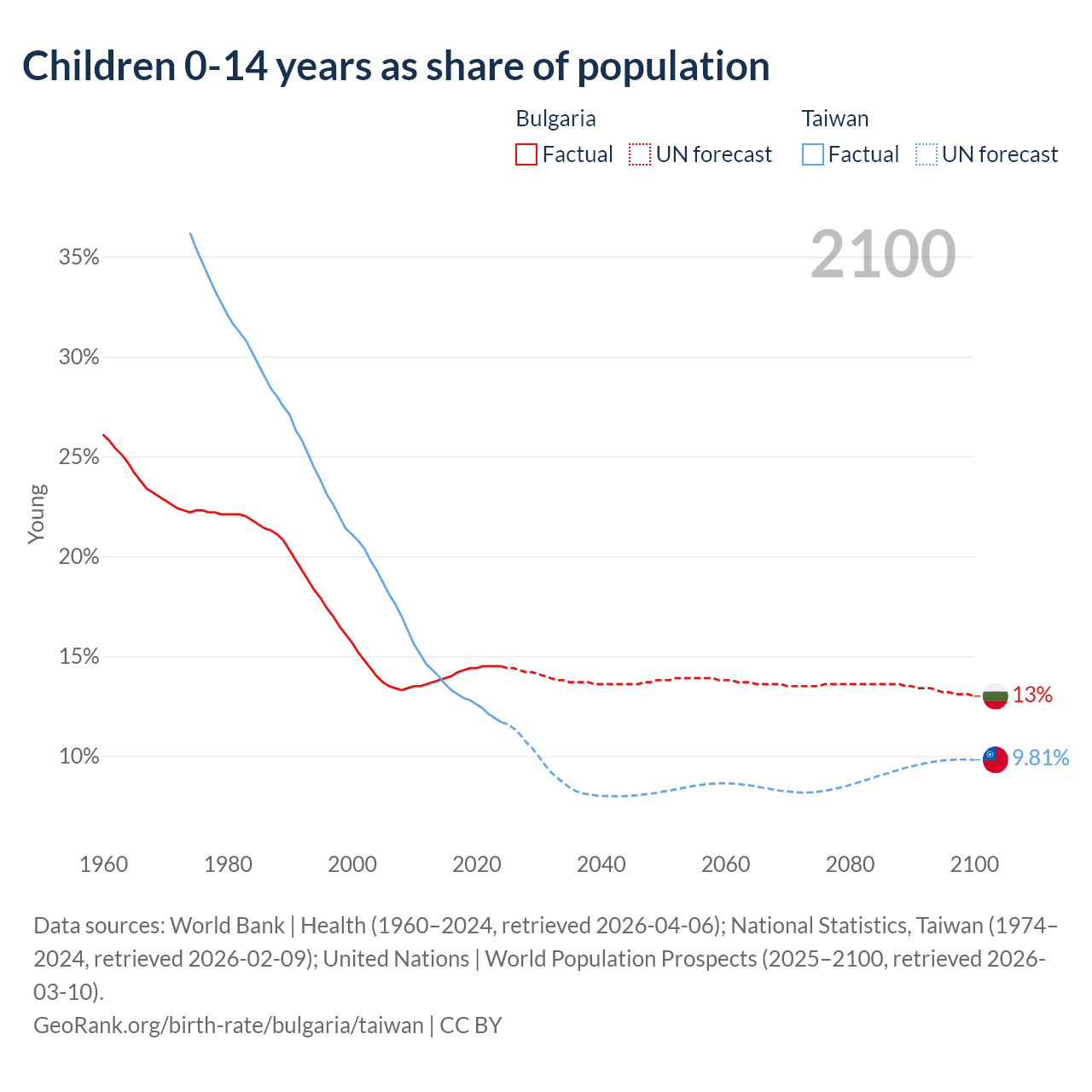 Data sources: World Bank | Health (1960–2024, retrieved 2026-04-06); National Statistics, Taiwan (1974–2024, retrieved 2026-02-09); United Nations | World Population Prospects (2025–2100, retrieved 2026-03-10).