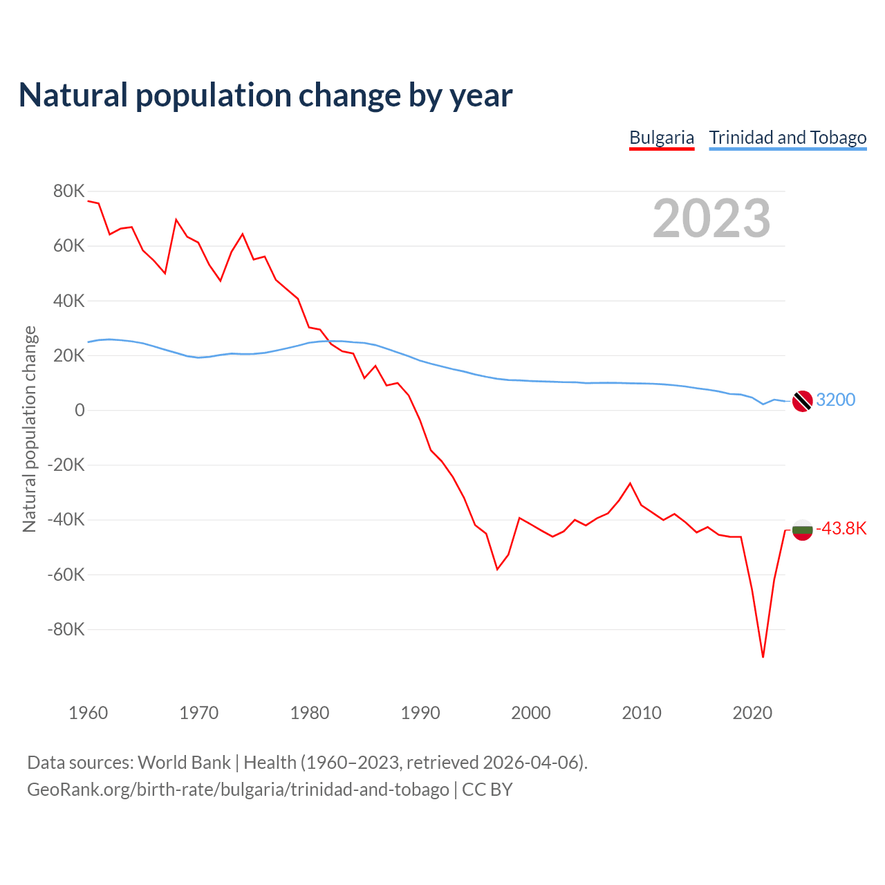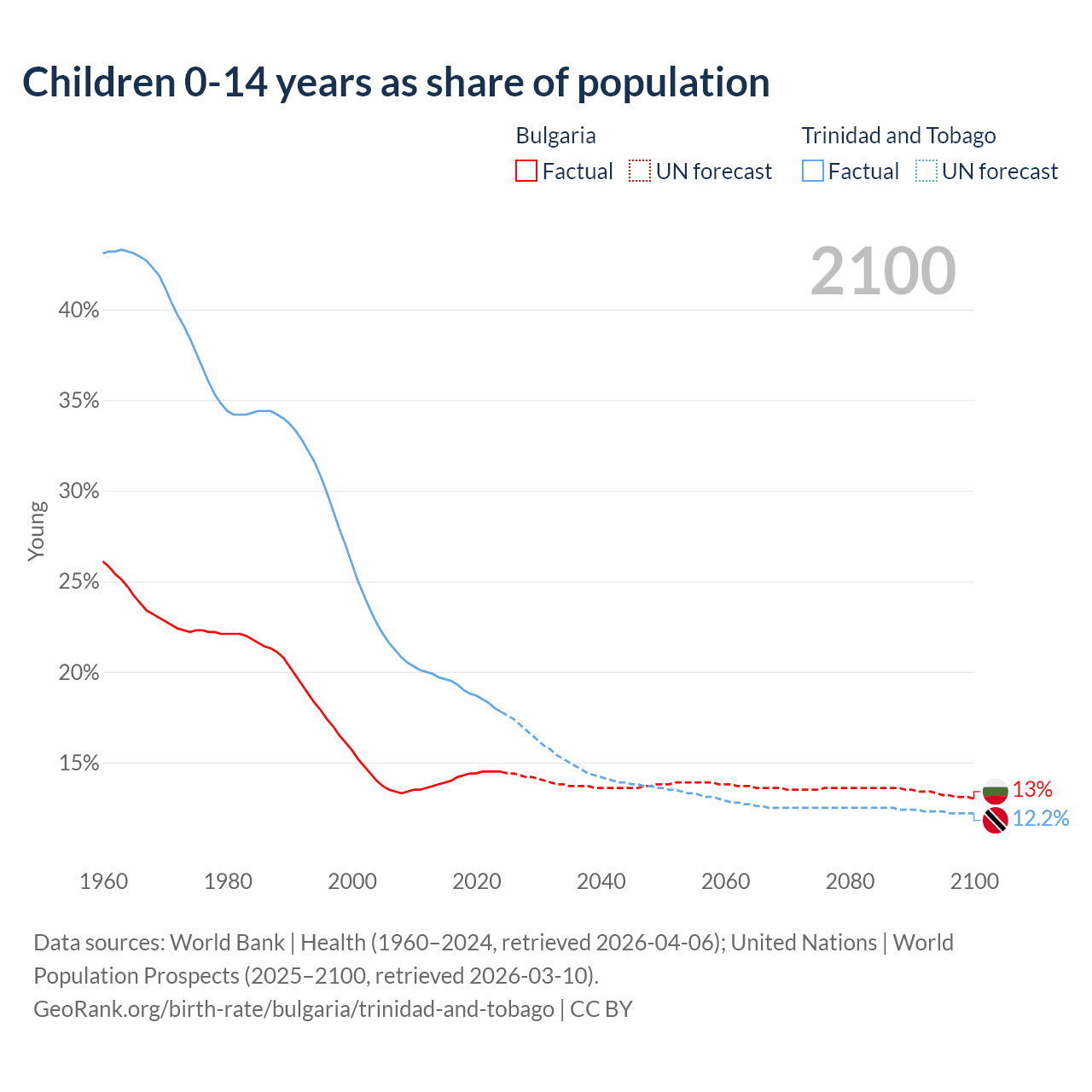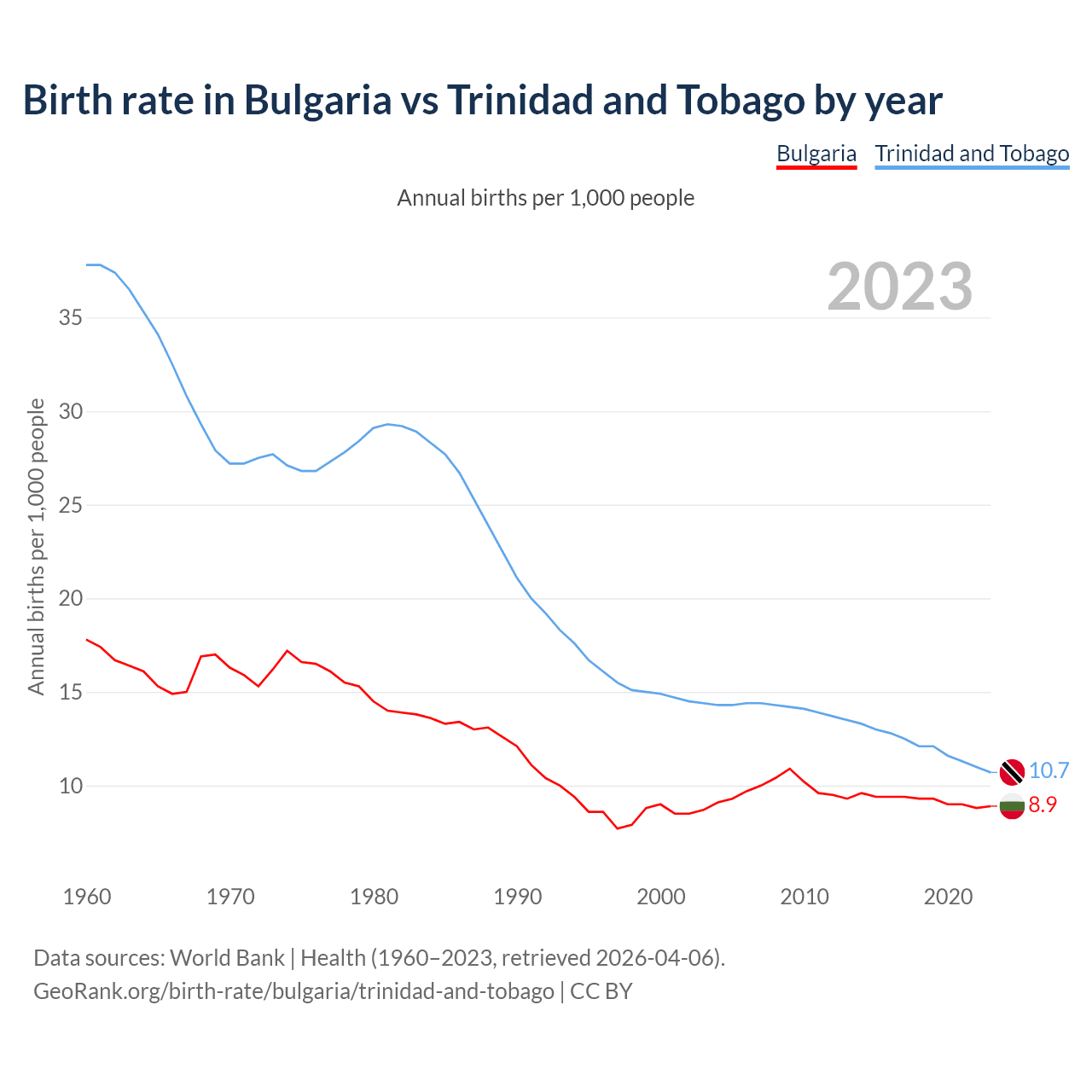 According to the latest available data on birth rates, the fertility rate in Bulgaria was 1.81 children per woman in 2023, compared to 1.53 in Trinidad and Tobago in 2023. The replacement level is considered to be 2.1 children per woman.