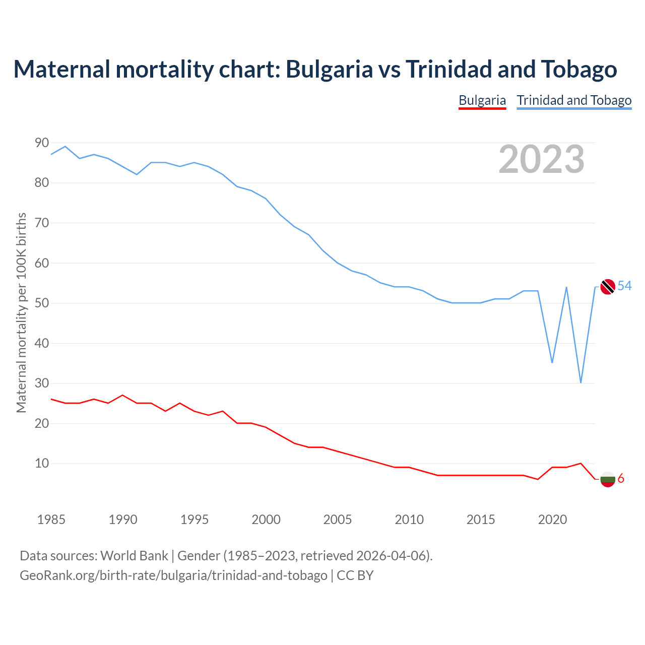 The maternal mortality rate, which is the probability of dying during childbirth or within 42 days of pregnancy termination, is 6 deaths per 100,000 live births in Bulgaria, compared to 54 deaths in Trinidad and Tobago.