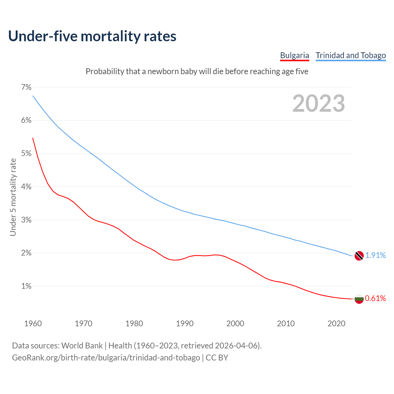 The chance that a newborn baby will die before reaching age five is 0.61% in Bulgaria and 1.91% in Trinidad and Tobago. Above is a chart with historical data on under-five mortality rates.