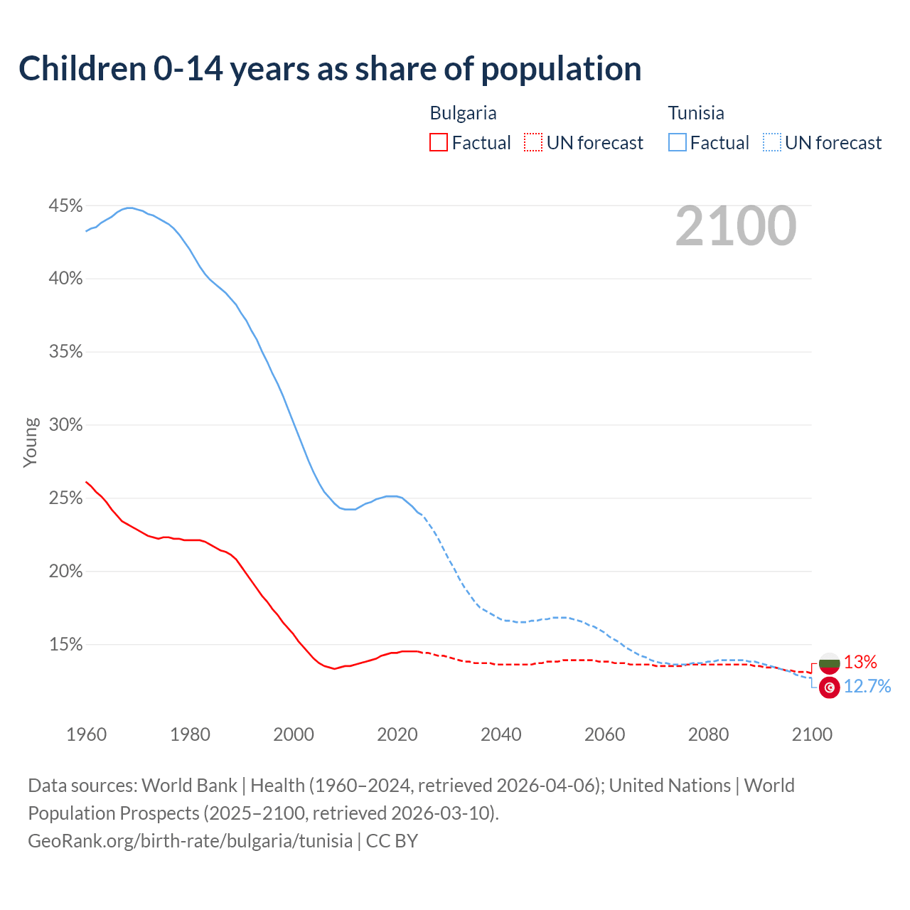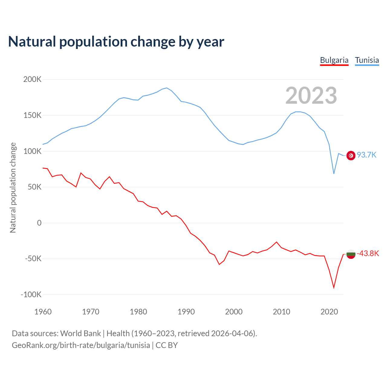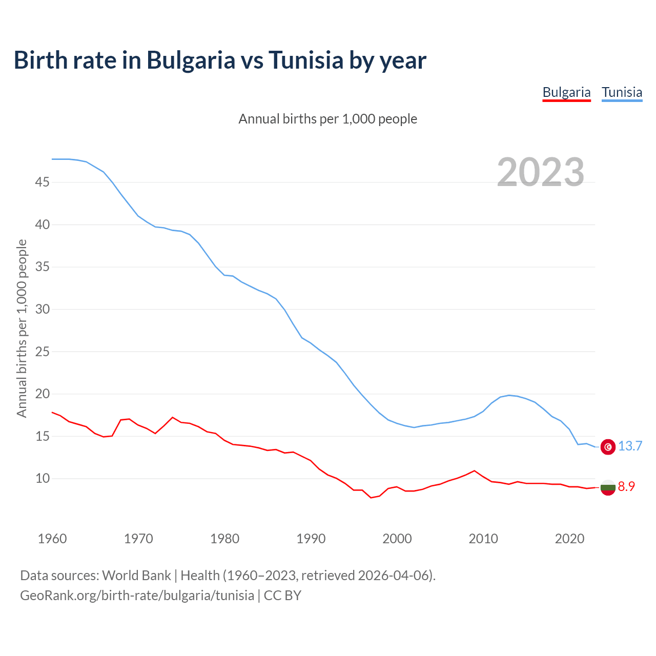 According to the latest available data on birth rates, the fertility rate in Bulgaria was 1.81 children per woman in 2023, compared to 1.83 in Tunisia in 2023. The replacement level is considered to be 2.1 children per woman.